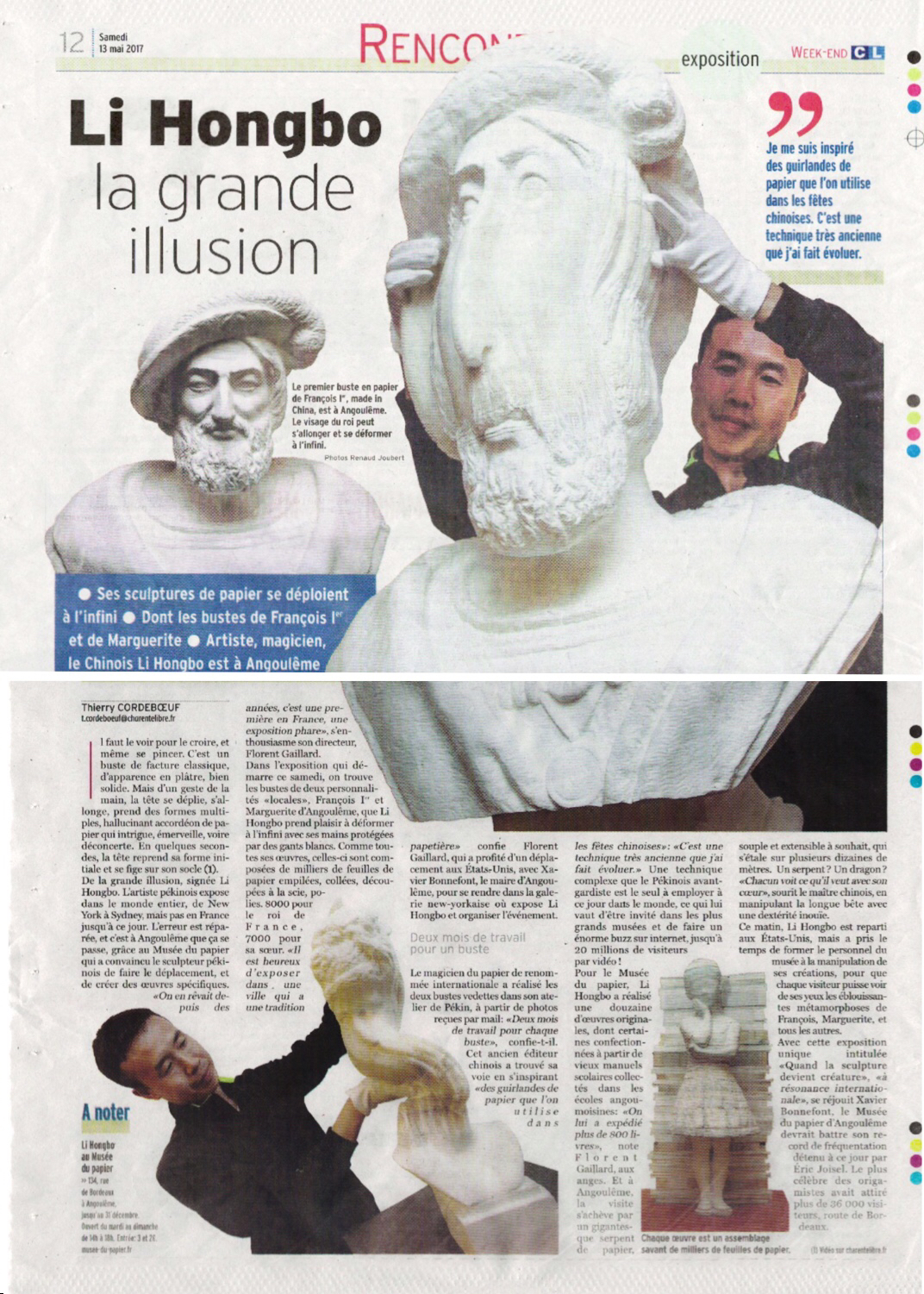 French newspaper highlights Li Hongbo's solo exhibtion "Quand La Sculpture Devient Créature,". Musée du Papier, Angoulême, France.