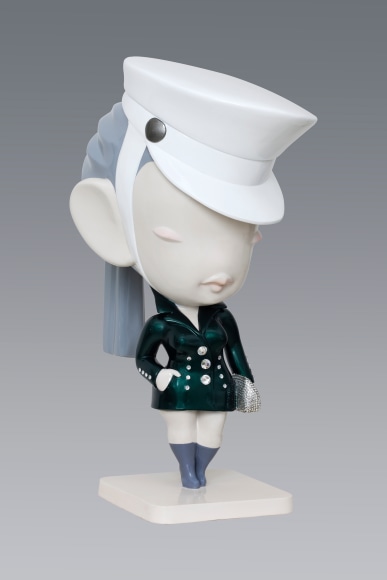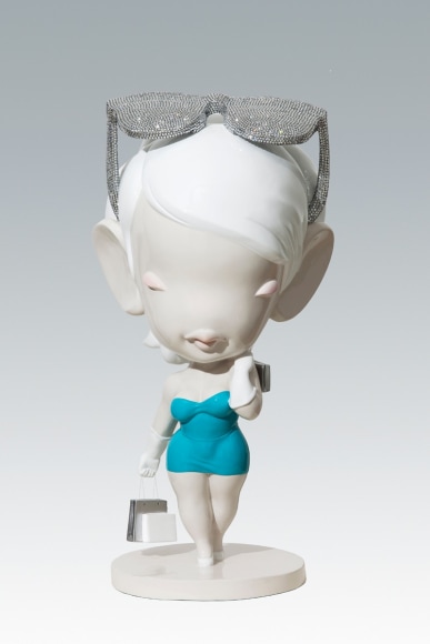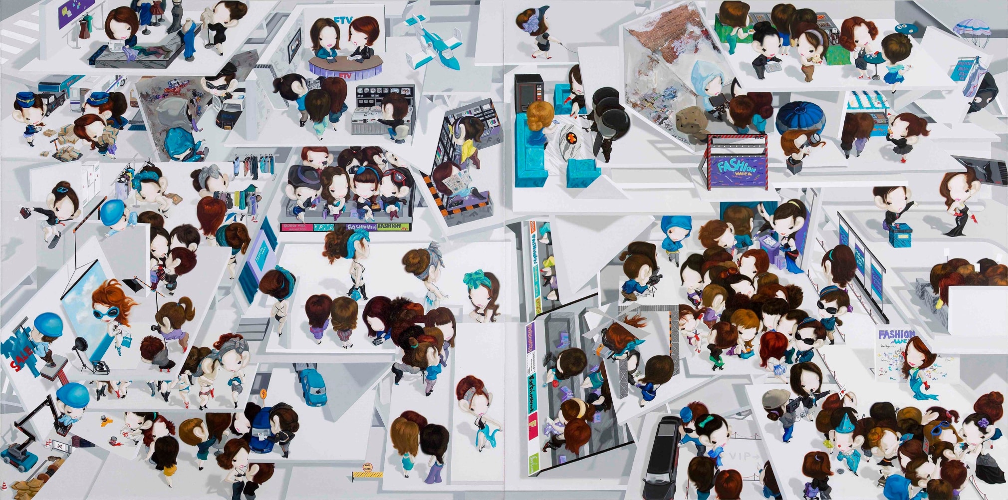 在“一半是沉溺,一半是超然”的展览中,人于客体的同质化处理构成了韩娅娟对这个世界独特的表达。奢华的饰品依旧充斥于她的画作;象征着充裕物质主义的物体,从潜水装备到宇航服,贯穿在作品当中。同时,消费的乐趣得到淋漓尽致的发挥-- 几乎所有的时尚元素都能在她的作品里找到标示性的运用。韩娅娟采用她署名“日式可爱”的女性形象和奢华配饰与性感时装的偏向做出对比,准确捕捉了当今中国消费社会对物质不断追求的欲望。