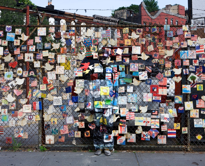 而最新“纽约迷彩”系列的作品,呈现了9/11事件的不同视角。在“世贸大厦遗址”一作里,世贸中心的倒塌现场显得如此的宁静,它的颜色似乎显得更为的安静与柔和。新建成的自由大厦在大雾里隐约可见,而它模糊的轮廓似乎折射着人们从这次灾难中恢复过程中依旧存留的害怕。这件作品展现着人们谨慎且缓慢的愈合过程,以及对于那次灾难依稀保存的记忆影像。相反的,“美国的瓦片”则更为直接的传达9/11事件的悲痛。每片瓦砾,都有着其本身的意义和自身的艺术价值;当它们并列一起时,爱国主义的气息更加强烈,从中也清楚的看出勇气和团结的重要性。藉由这两件作品,刘勃麟保存了这个具有社会性,历史性的大悲剧,同时也将历史转变成为了艺术。