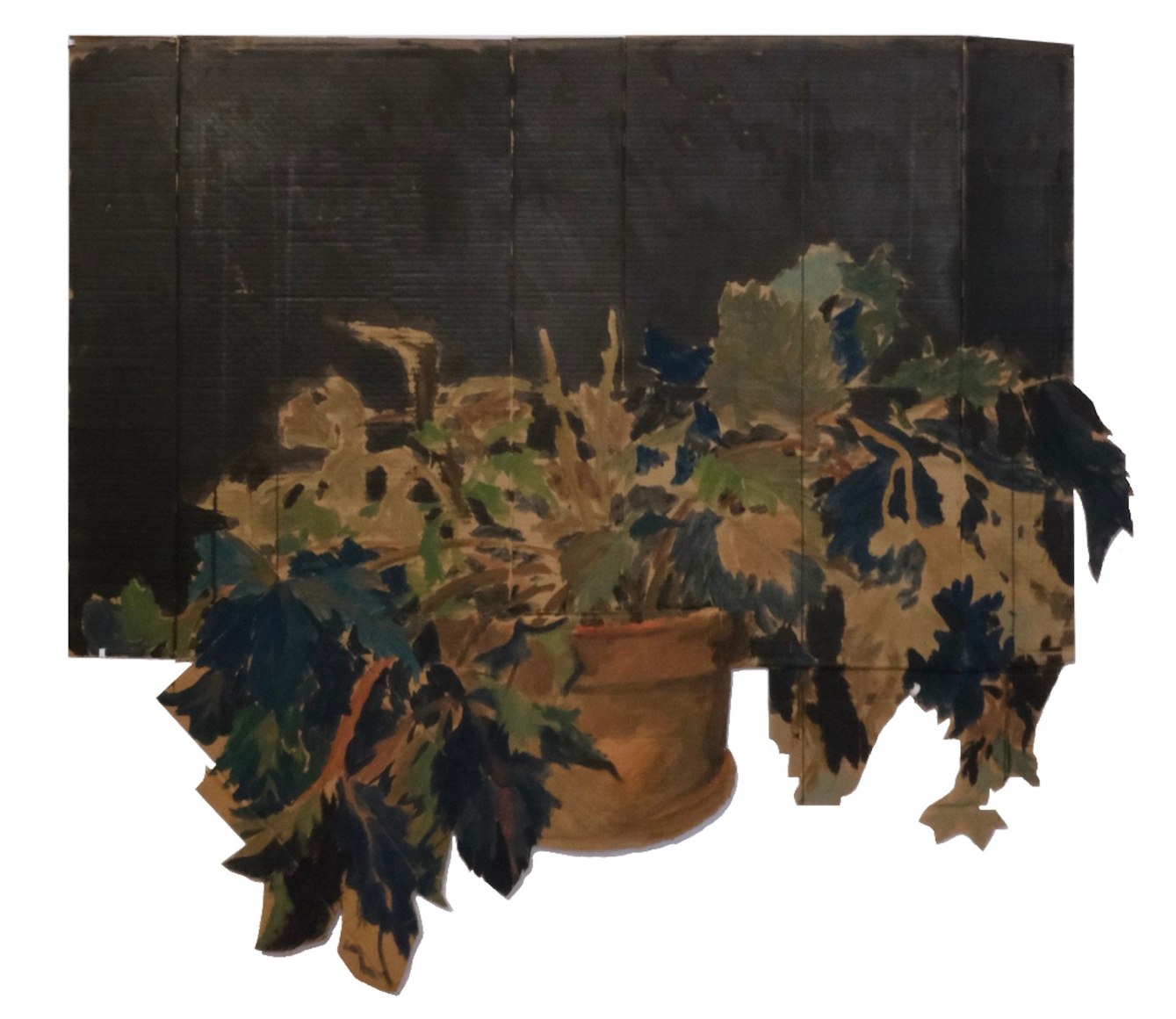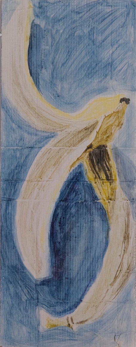 Alongside Wu’s portraits, depictions of mortal flora and beings of immemorial existence coalesce into a cohesive vision of cultural perception. Wu’s Banana series is featured prominently in the show, done on cardboard and painted as if in motion, tossed up in the air. Yet the bananas also seem stationary, resting on the ground. The chosen materials at the core of the series reflect Wu’s tongue-in-cheek response to life in New York. Banana peels and cardboard are the discarded shells of what has now been removed.