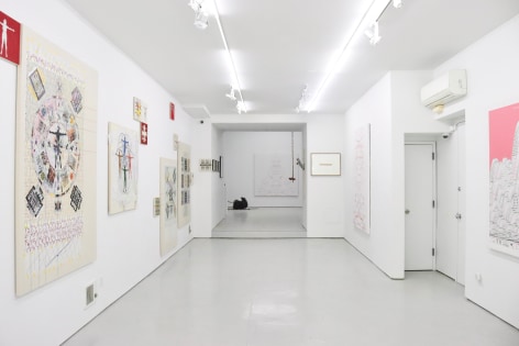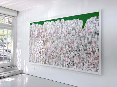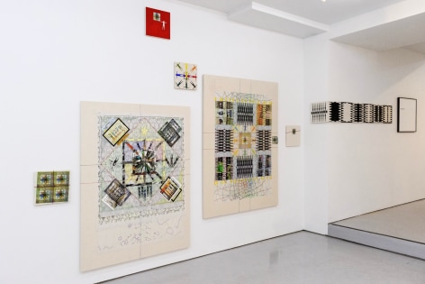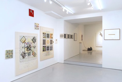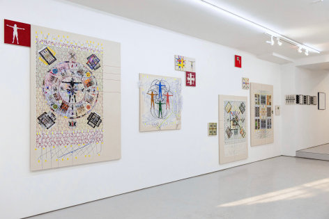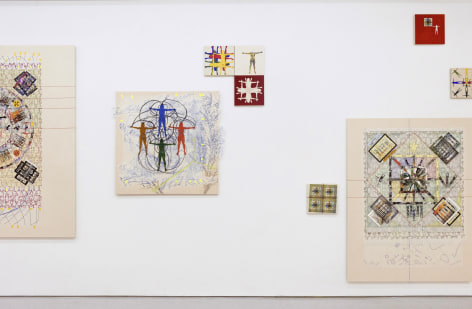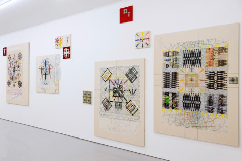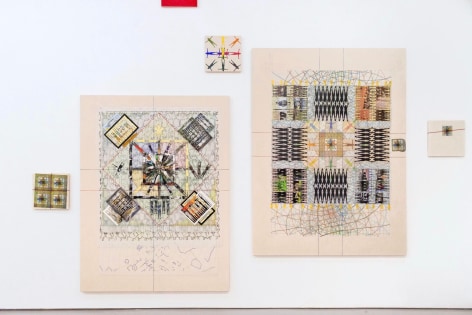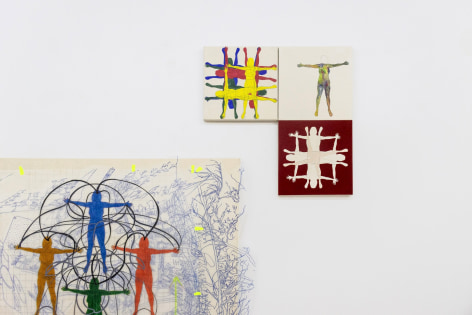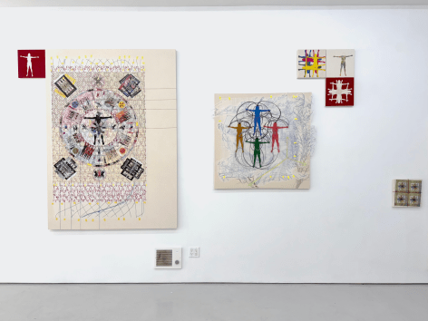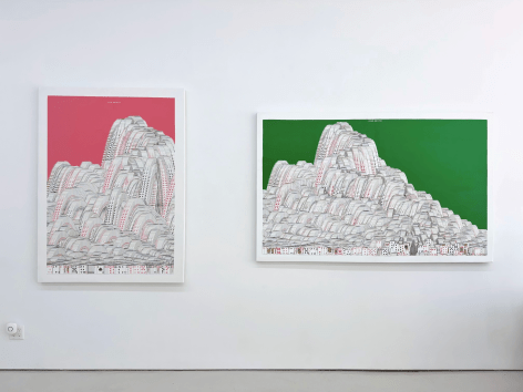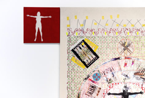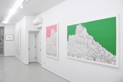 Yang Shuai’s mastery in printmaking enables her to apply the principles of “multiplicity”—the foundation of printmaking—onto other mediums. During the residency, she defines herself as the base unit of measurement. With this methodology in mind, Shuai continues to examine the relationship between one and many - repeatedly juxtaposing herself (the constant) with free-handing drawing, collages, prints, risographs, paintings, and etc. (the variables). Shuai has also developed systems to contextualize how the self is used as a measurement. Gridding, matrixing, tile-making, net-making are all examples of this formal but humanitarian approach. Shuai displays the whole spectrum of human society with an entire wall of new works, carefully systemized and laid-out.