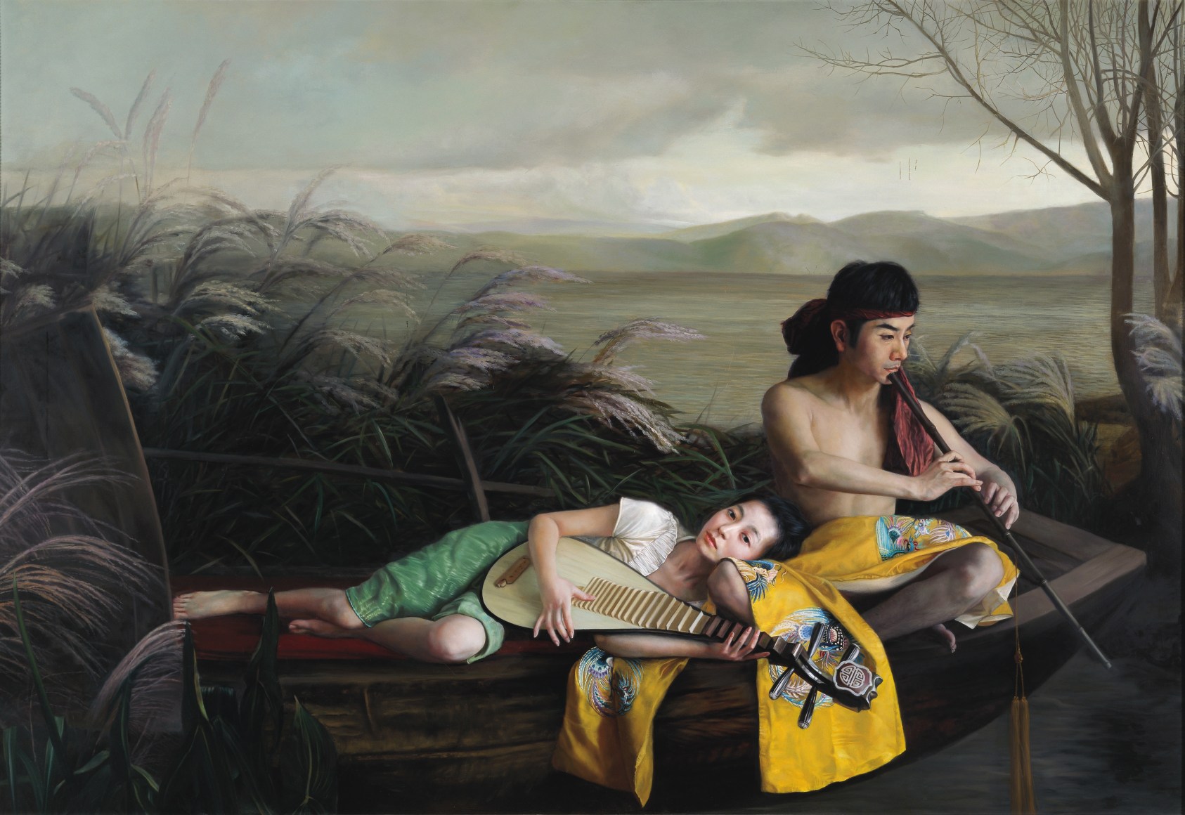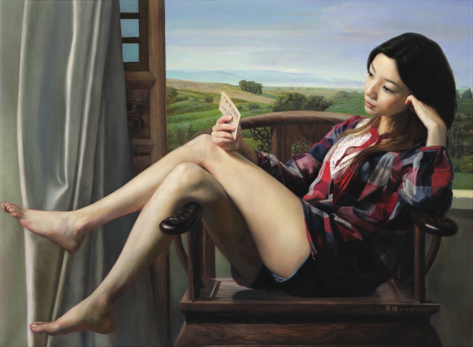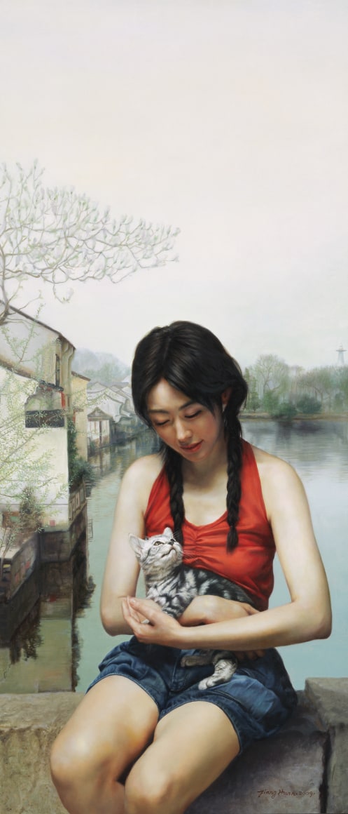 A Chinese contemporary realist painter, Jiang Huan is engaged in a foreign craft explored only since the beginning of the 20th century by artists and art schools in China. He masters the oil painting technique to such an extent that the figure and scene seem alive. The painter’s desire to create a realistic portrait of ideal beauty allows the spectator to draw a visual parallel with such painters as Ingres, Hans Holbein, Jan van Eyck, Raphael and contemporary Chinese artists Ai Xuan and He Duoling. The renderings appear so realistic that it is surprising that the scenes and landscapes are painted in the studio, as the old masters of the craft had done and not on site. Shiny, velvety brushstrokes are used to create the illusion of flesh and texture of the skin.