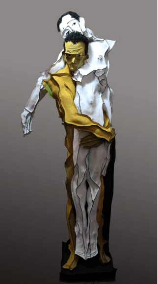 Li Hongbo explores the adaptability of his medium by playing with the concept of the children’s toy called ‘paper gourd’. This toy is made from a stack of interconnected sheets of thin paper that can be stretched to form new shapes. Li Hongbo’s paper figures challenge the human form. Resembling human bodies, they rebuild the idea of what the human form can look like. The flexibility of these sculptures allows for a hyper-extension of the limbs, creating abstraction from realism. These elongated limbs, which have the ability to tumble out from the figure’s barely distinguishable core, allow us to find a new, playful and anomalous aesthetic.