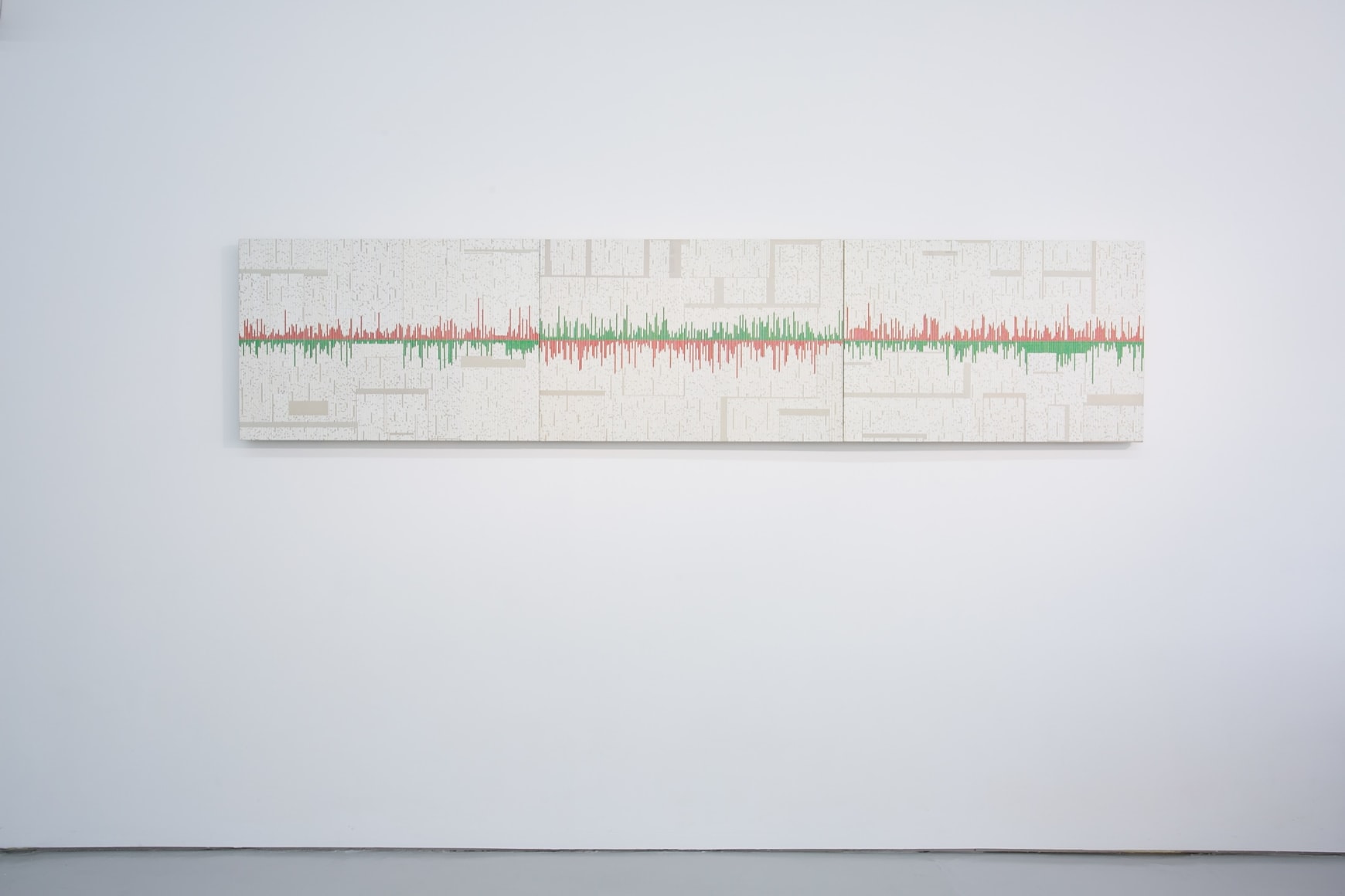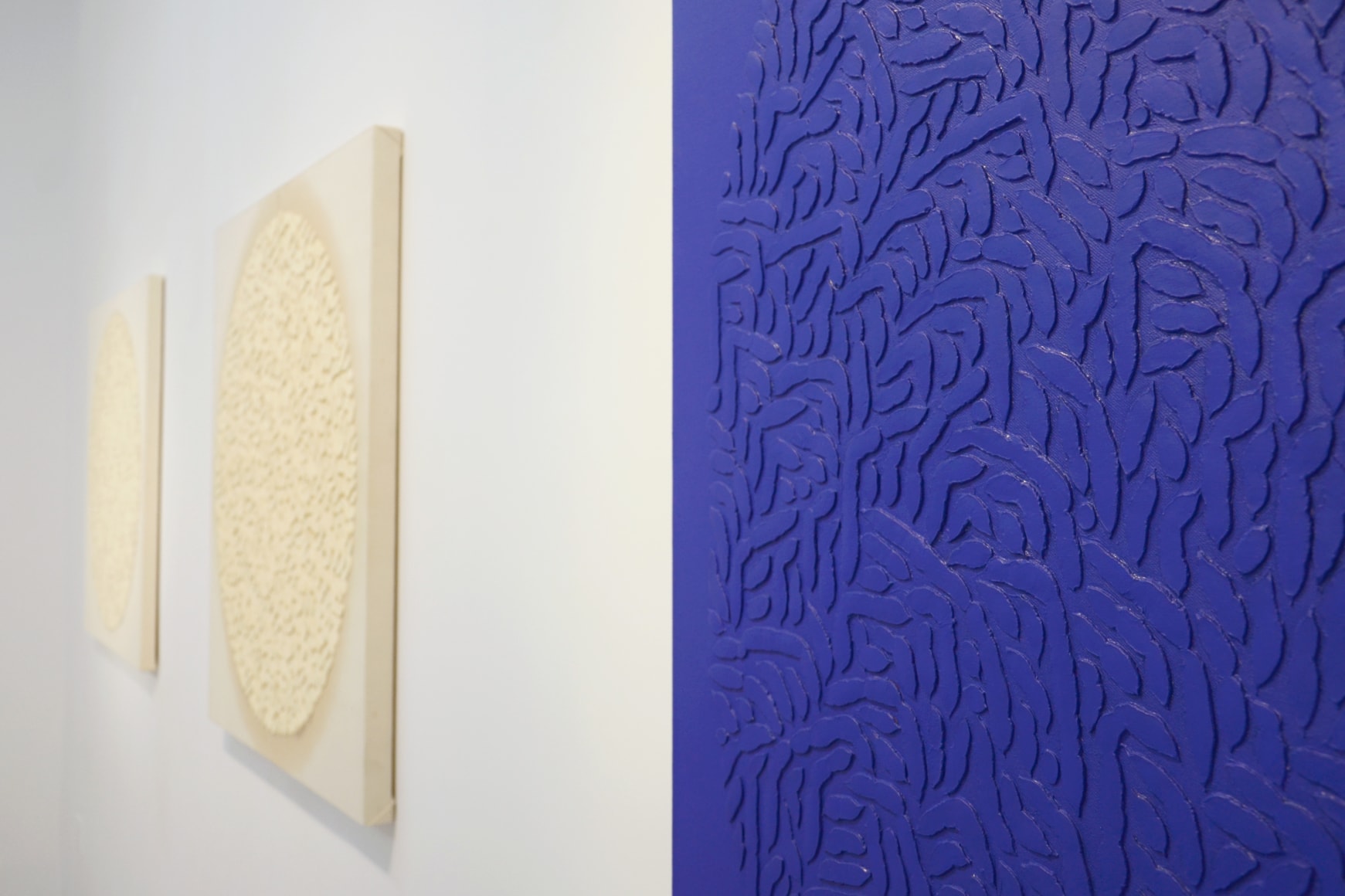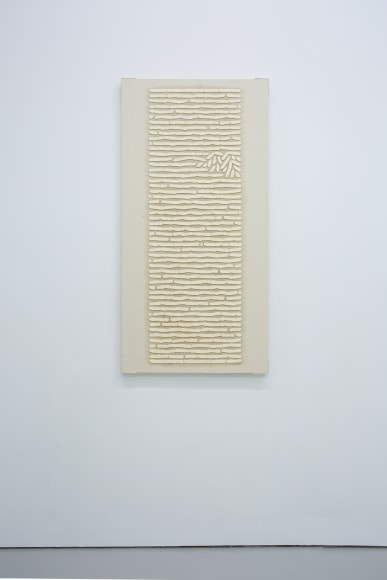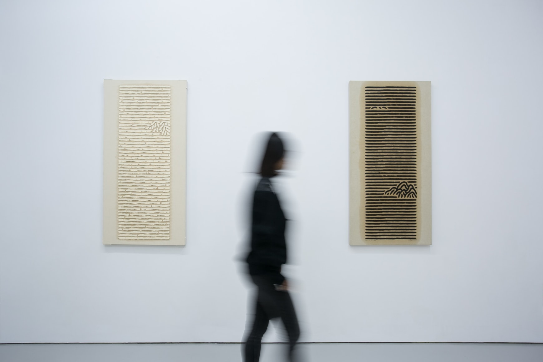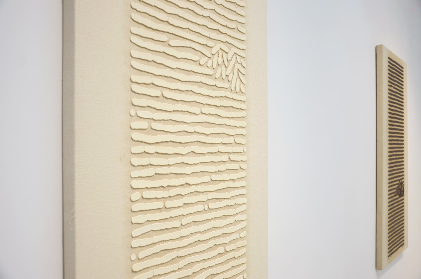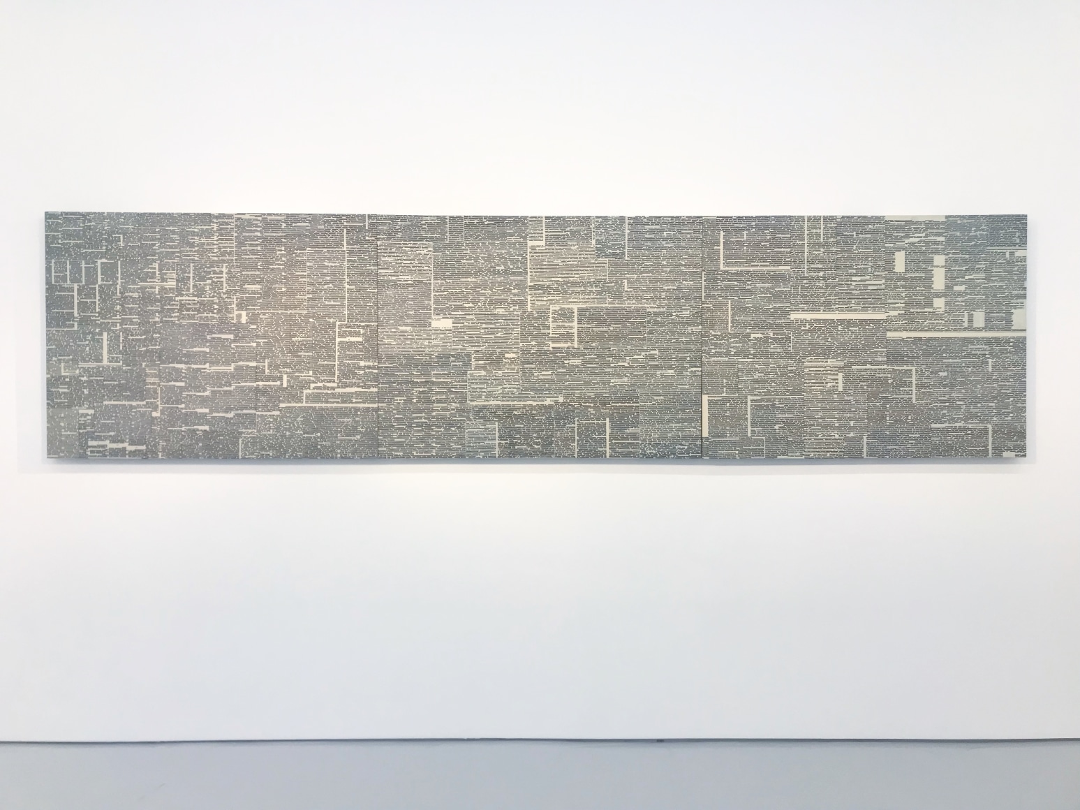 Finally, in his more recent acrylics on newspaper from his 2017 Punctuation series, Shen eliminates texts from Chinese newspapers such as People’s Daily until only the patterns and structures of the paragraphs are left, exploring such themes as censorship and surveillance as well as the temporality of words.
