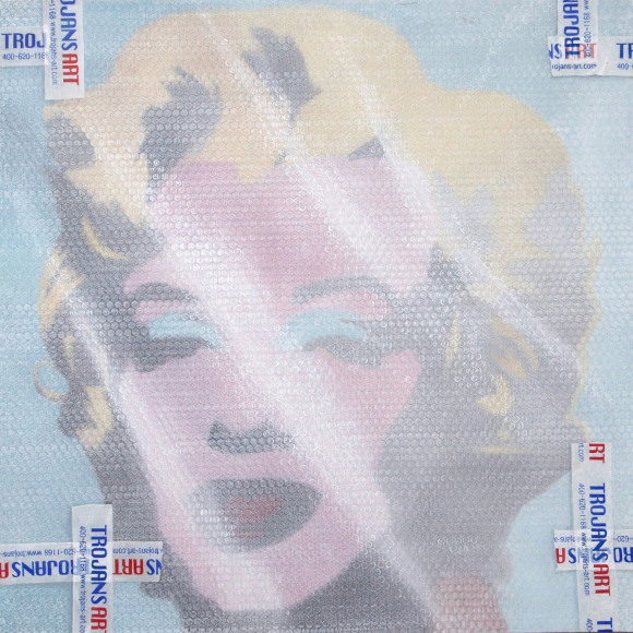 The series consists of more than twenty pieces portraying archetypal Pop Art works wrapped in protective plastic packaging. Through the translucent wrappings, the works are still vaguely visible; the viewer can immediately identify these works as replicas of Andy Warhol’s Campbell Soup and other portraitures of cultural figures such as Marilyn Monroe, Mao Zedong, and John Lennon. Various logos of art handling companies, which appear to have been taped on, overshadow Warhol’s highly recognizable “brands.” Shen Shaomin probes the nature of artistic creation through the appropriation of Warhol’s pieces which occupy important territory in the historical discourse concerning individuality and authenticity.
