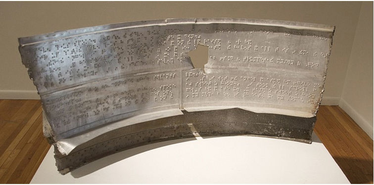 The series titled, "I Touched the Voice of God" encapsulates both of the statements made in "I Sleep on Top of Myself" and "I Want to Know What Infinity Is," but goes one step further to question human intelligence itself. Appropriated from a rocket sent into space, the material used in this series of work is embossed with English braille. Standing in front of these pieces, our vision blinds us from understanding what is written on each sculpture. One must, in fact, be blind in order to read the words within these mysterious objects. As symbols of our greater universe, the artist's choice to cover these rocket ship parts with a language most English speakers are illiterate in, reveals that the artist believes our typical, normal, and assumed modes of perception render us blind and unable to develop a true understanding of the universe.