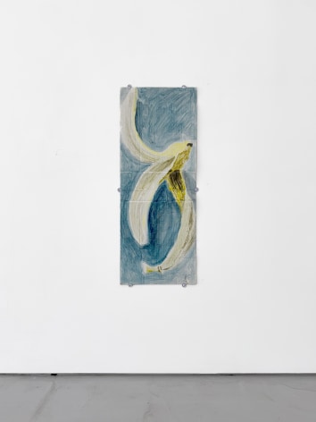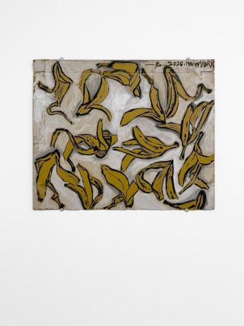 Alongside Wu’s portraits, depictions of mortal flora and beings of immemorial existence coalesce into a cohesive vision of cultural perception. Wu’s Banana series is featured prominently in the show, done on cardboard and painted as if in motion, tossed up in the air. Yet the bananas also seem stationary, resting on the ground. The chosen materials at the core of the series reflect Wu’s tongue-in-cheek response to life in New York. Banana peels and cardboard are the discarded shells of what has now been removed.