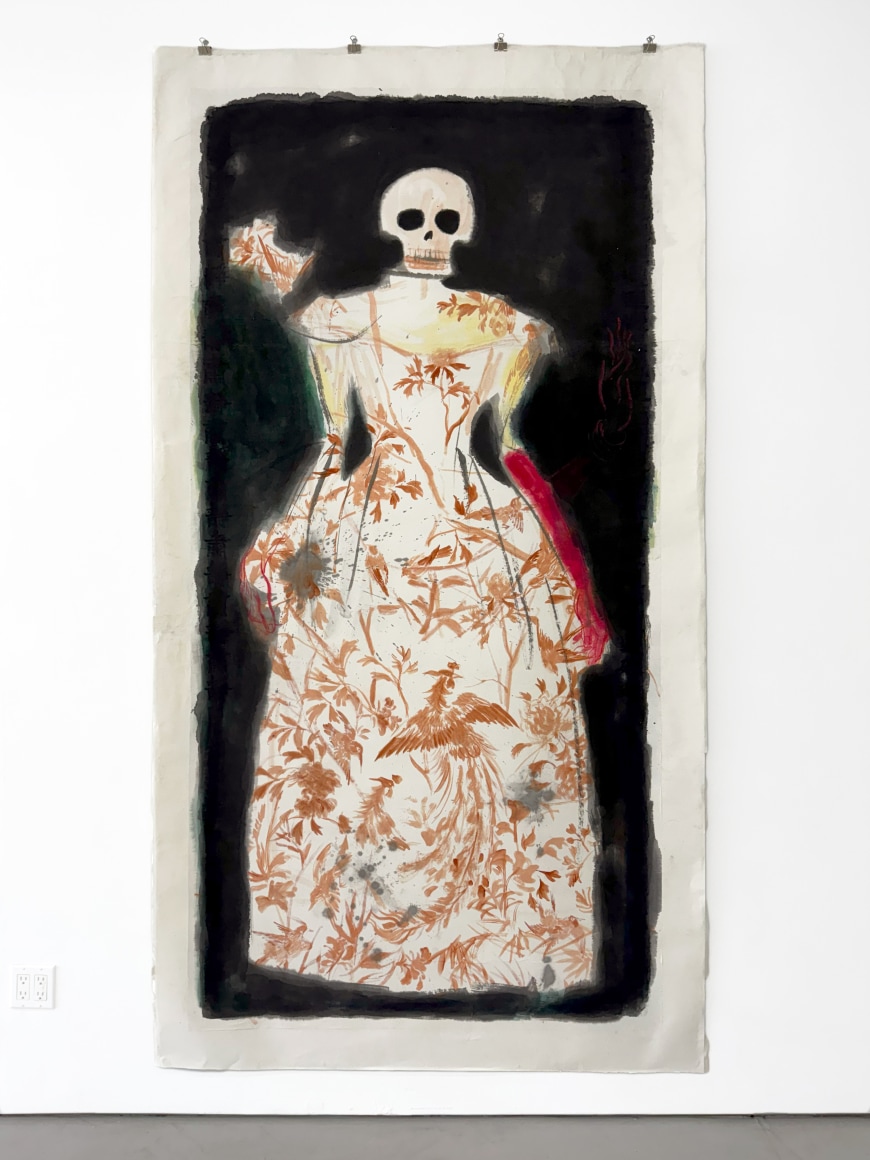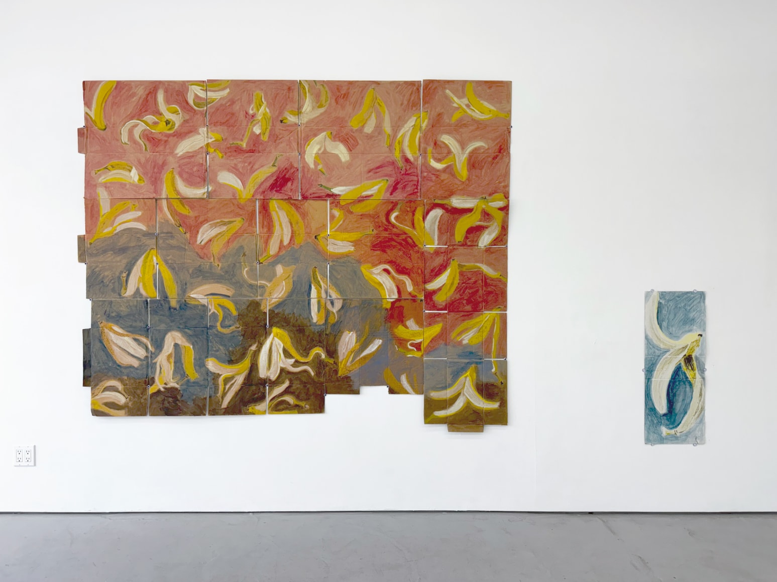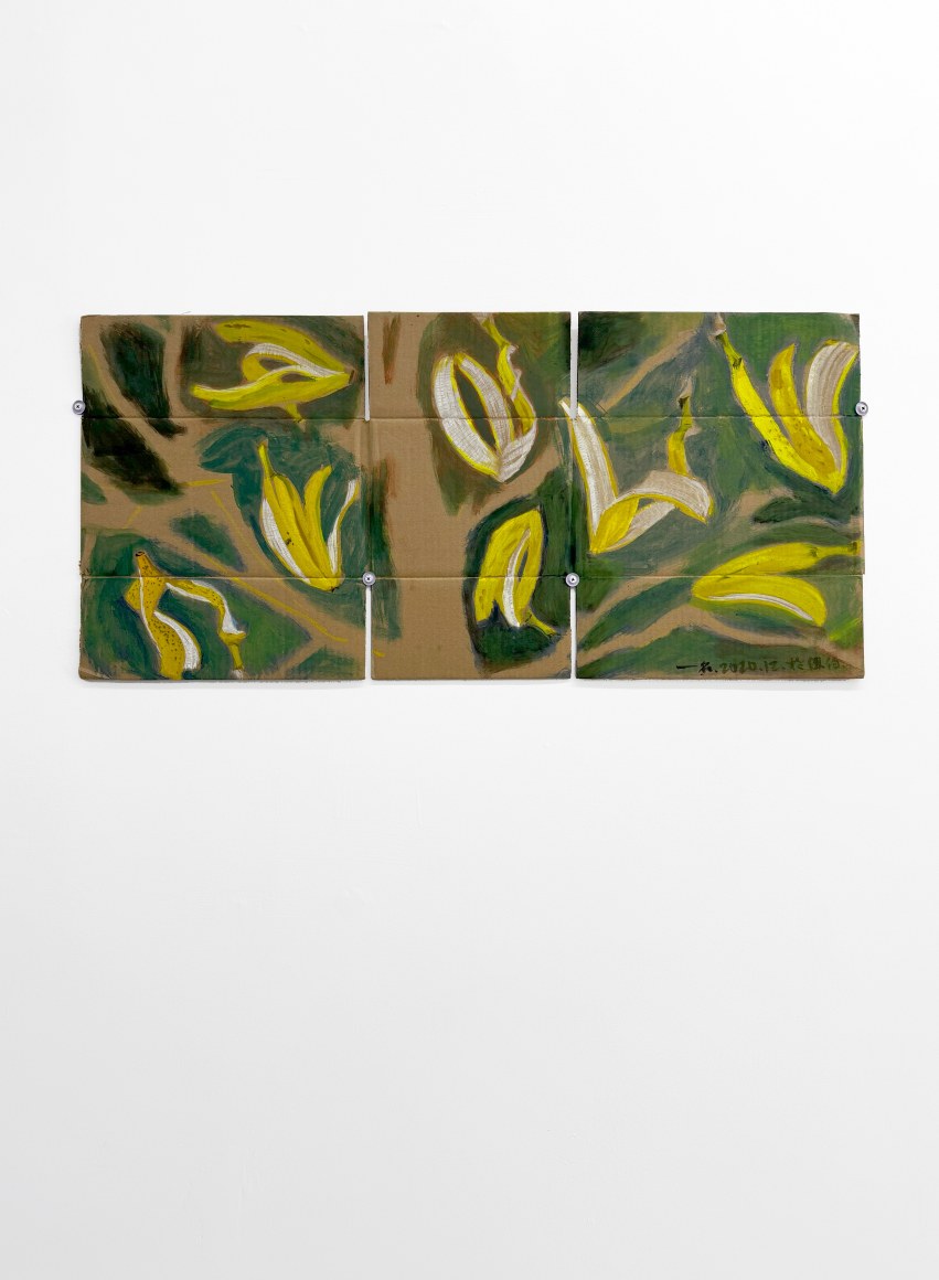 Alongside Wu’s portraits, depictions of mortal flora and beings of immemorial existence coalesce into a cohesive vision of cultural perception. Wu’s Banana series is featured prominently in the show, done on cardboard and painted as if in motion, tossed up in the air. Yet the bananas also seem stationary, resting on the ground. The chosen materials at the core of the series reflect Wu’s tongue-in-cheek response to life in New York. Banana peels and cardboard are the discarded shells of what has now been removed.