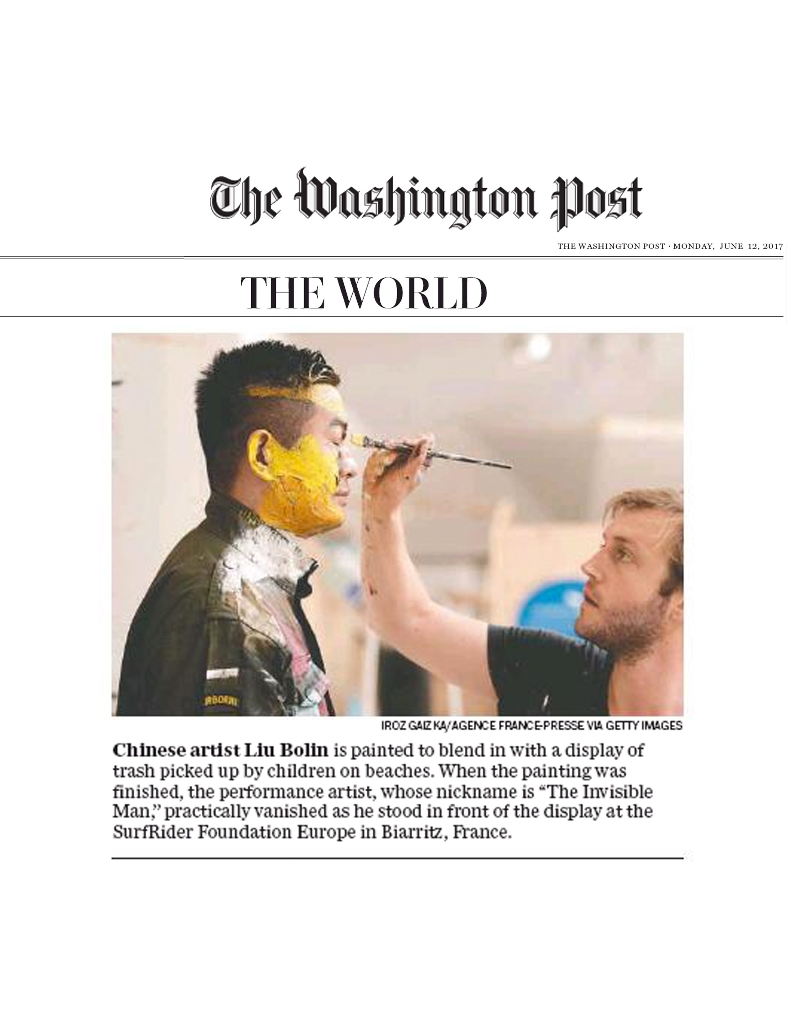 The Washington Post highlights Liu Bolin's participation with the SurfRider Foundation in hopes to bring awareness to water pollution.