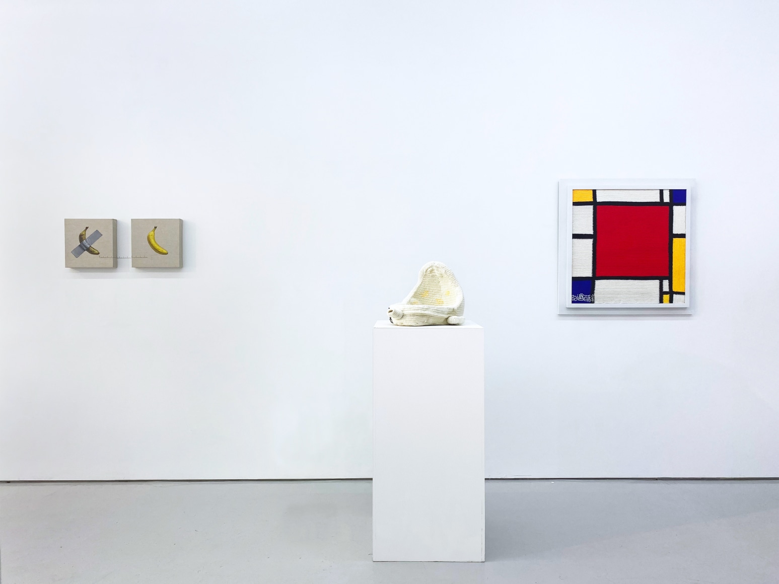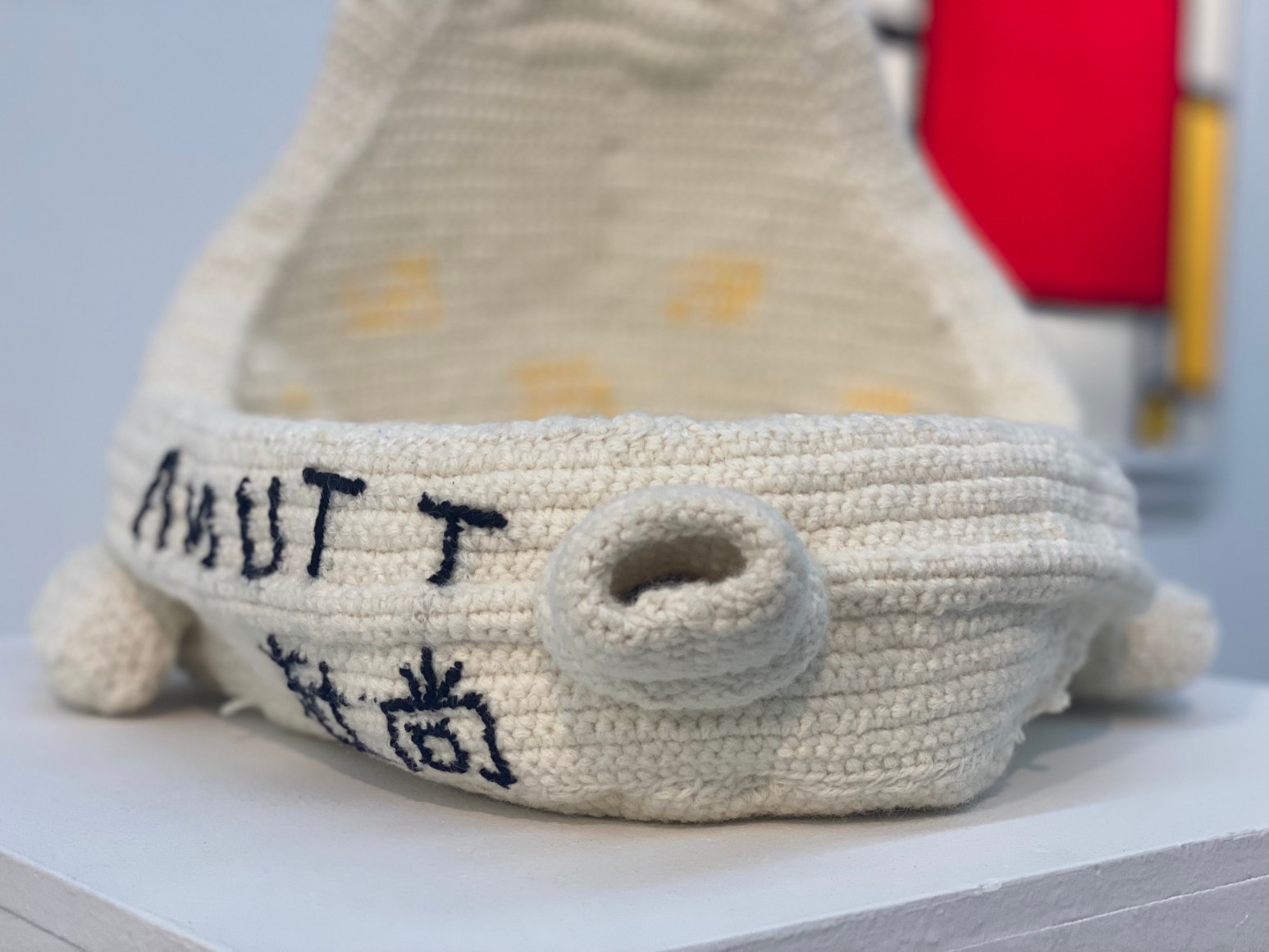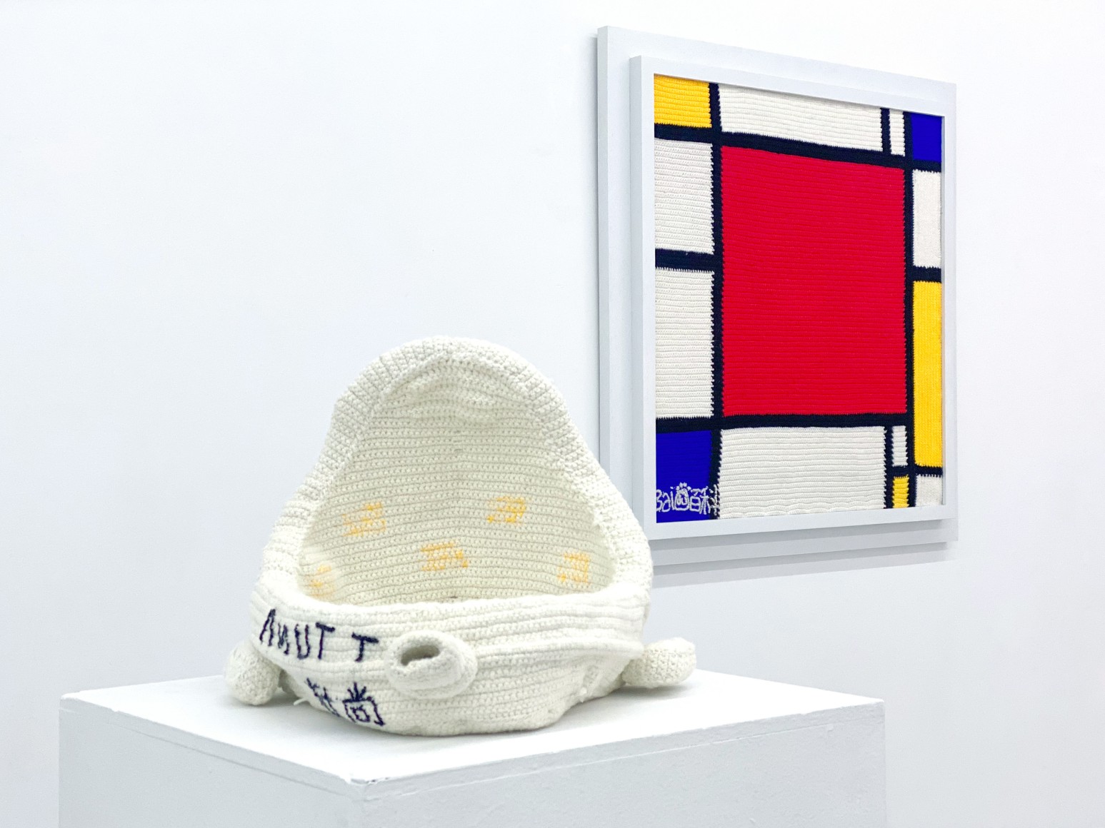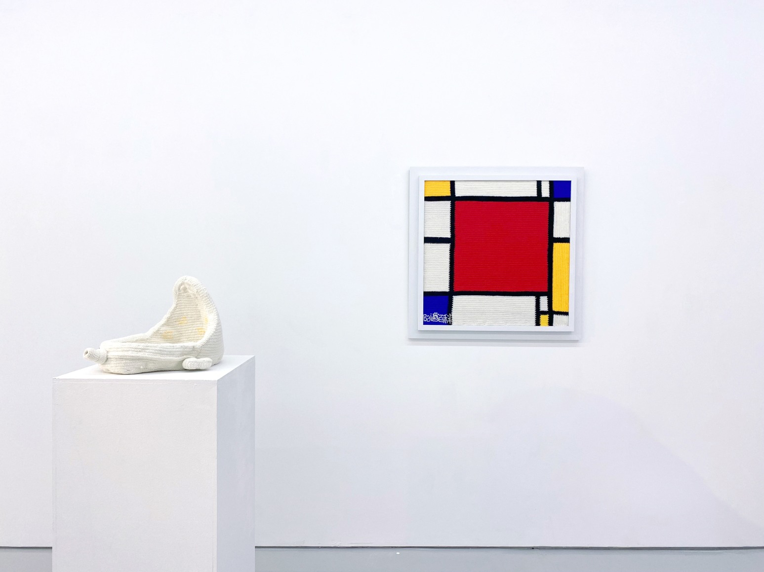 胡尹萍的《祖师西来意》由两件作品组成:杜尚的《泉》和蒙德里安的《红、黄、蓝的构成》。历史中的世界级大师从生活中提炼出经典,艺术家胡尹萍则邀请了自己老家乡下的阿姨,用她们熟悉的手工针织对这些大师作品进行重新解读与创作。阿姨们的妙手描绘与锦上添花仿佛使这些看似遥不可及的殿堂级作品变成了1.5 件“玩世不恭”的艺术品。