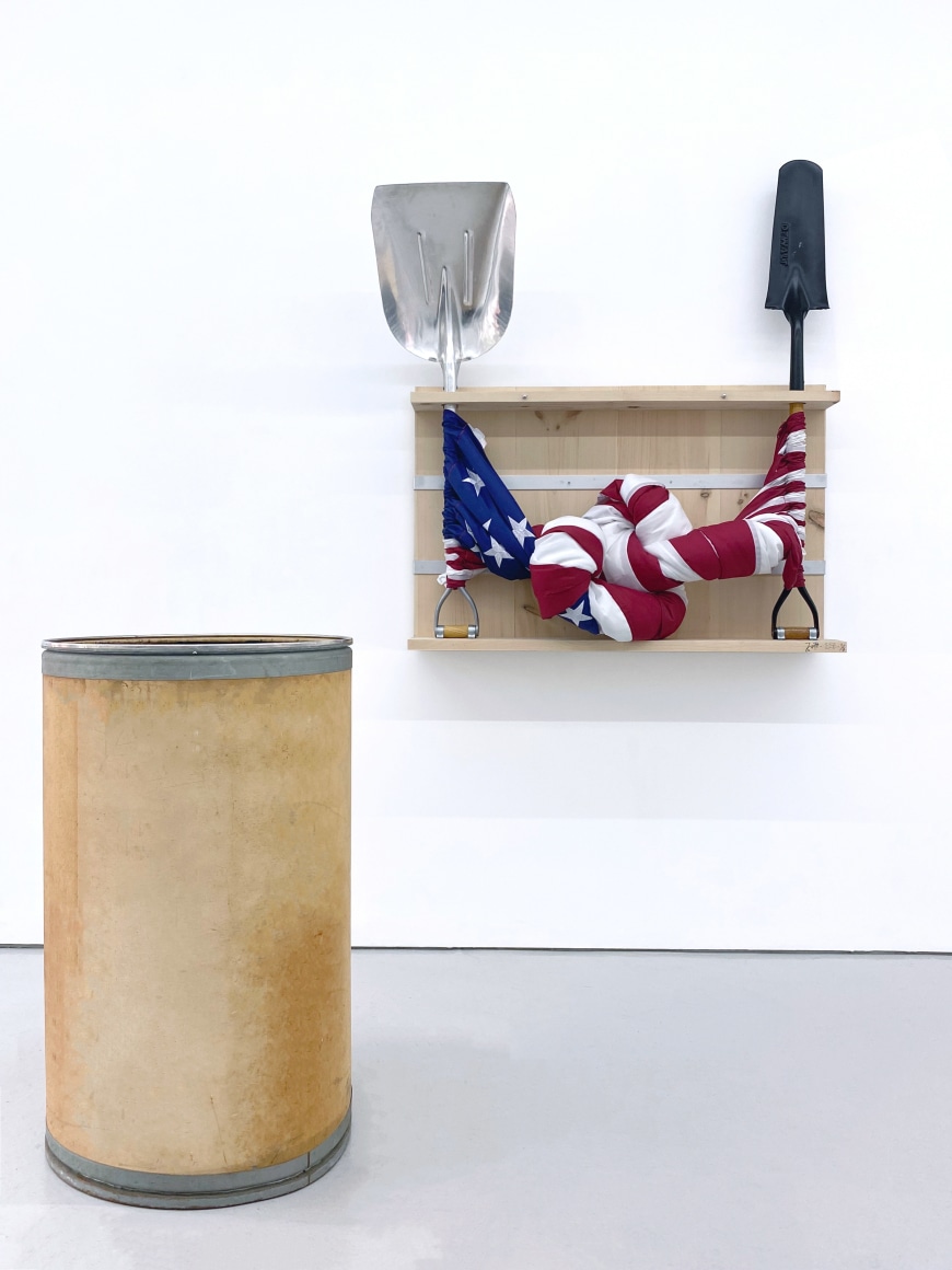最后,推动边界的艺术家组合孙原&彭禹为这次展览带来两件装置作品。其一看似稳固,另一则流变于不确定之中,两件作品通过看似矛盾的形态,影射后疫情时代的全球社会环境现状。在第一件作品中,一面美国国旗被扭曲地绑在两把铲子中间,两端铲子直立形成稳定的造型和国旗的扭曲产生势能差,似乎是为了引发某种警惕。相比于这“100%”全然如一的“确定性”,另一件实验装置则如同“50%”所代表的“可能性”,扮演过于不确定且混沌的角色——一只塑料手在水面上浮浮沉沉、不断做着不规则运动,而牵引其运动的机关却隐藏在水下深处。孙原&彭禹在这组作品中延续了长期以来对机械与结构的痴迷,各种部件的运动揭示了对世界的深刻隐喻:我们的社会体系有如一座机器,其规律和法则时而彰显、时而被藏匿。