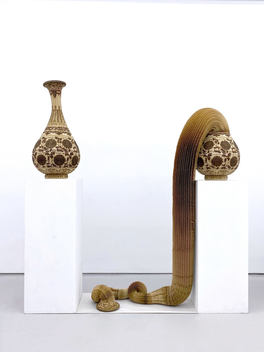 李洪波此次展出的两件纸质作品,一件将被完整呈现,另一件则故意将一半拉伸到地上,只向观众呈现一个局部。作品有意回归到他和Eli Klein画廊愈十年的合作中最常展出的媒介——纸雕塑。
