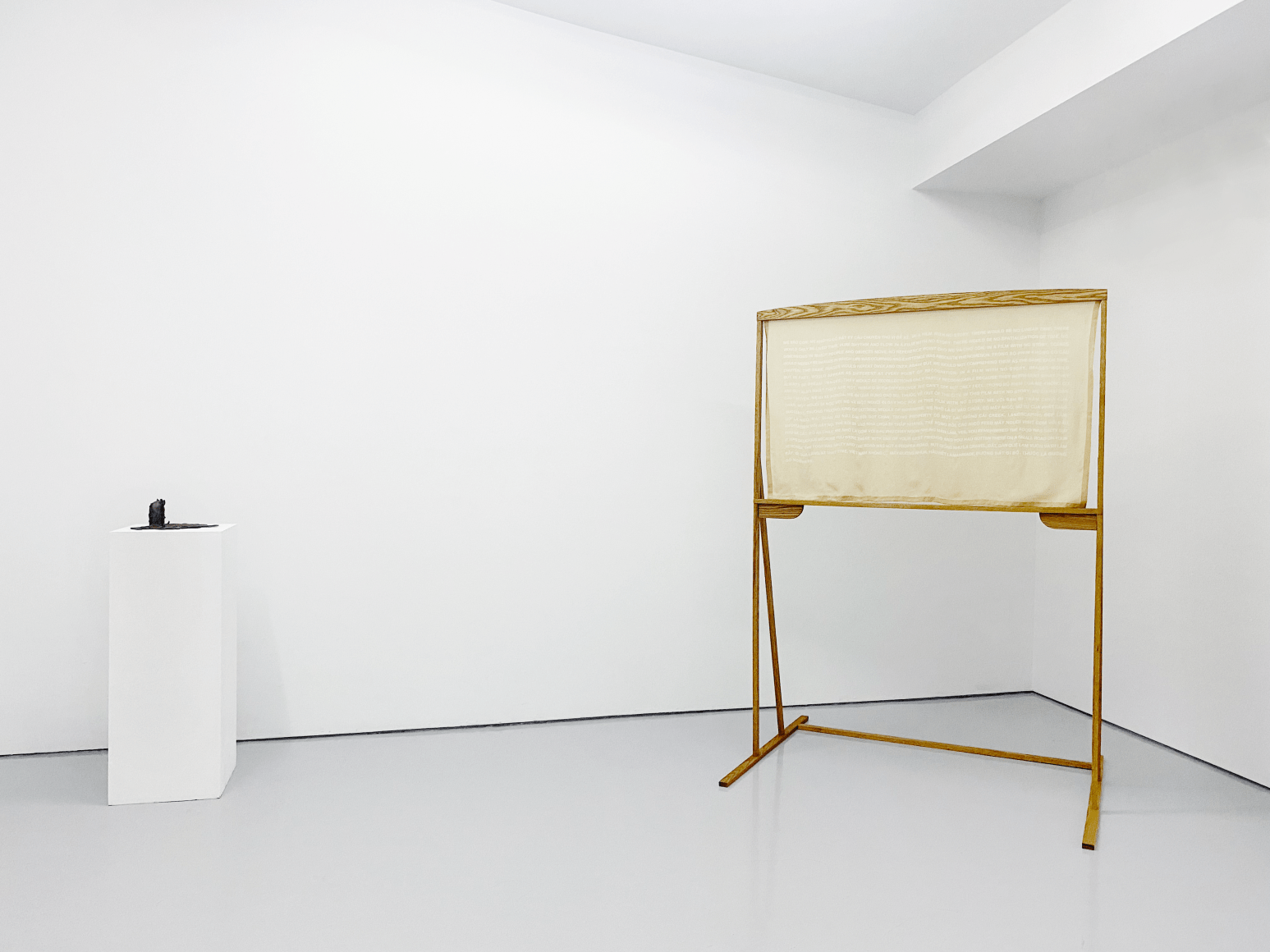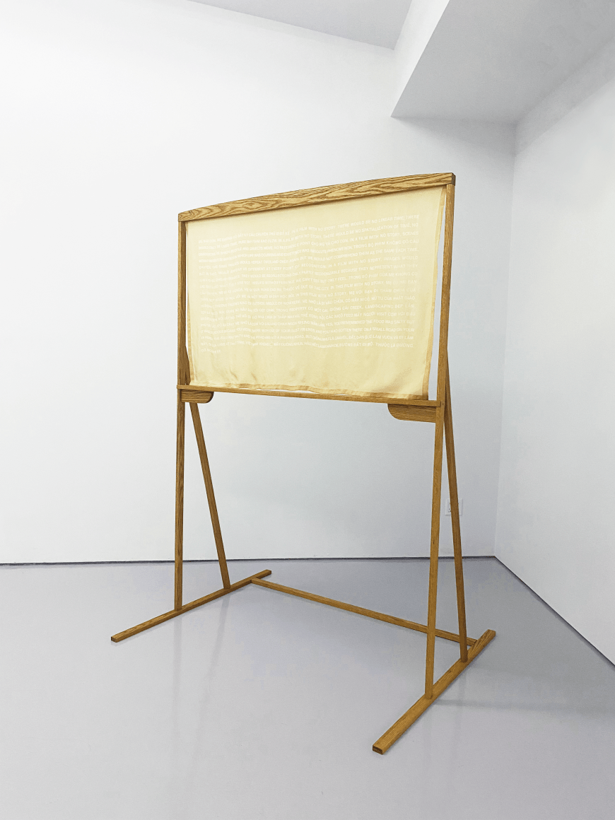 由“为哀痛的语言”为中心展开,Patty Chang、Maia Ruth Lee和Hồng-Ân Trương的作品呈现 出伤痛的多样表述方式,核心在于其不确定性与多变性。Hồng-Ân Trương在《The salt that stays on your tongue.》中,将一段写给母亲的文字通过越南语和英语两种文字,写在一面丝 质氰版制的独立“屏风”上,继而构架叙述者与观者间的联系。Patty Chang的《List of Invocations》以书信的方式,通过对身体病症、药物治疗和情绪反应交杂的记述,将日常生活 记录在临终体验中。Maia Ruth Lee则是通过结构难以辨识却易于重组的缝纫图案,使无声的伤 痛语言具像化。