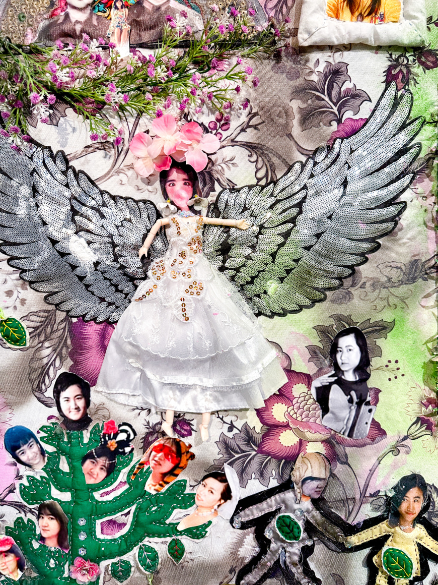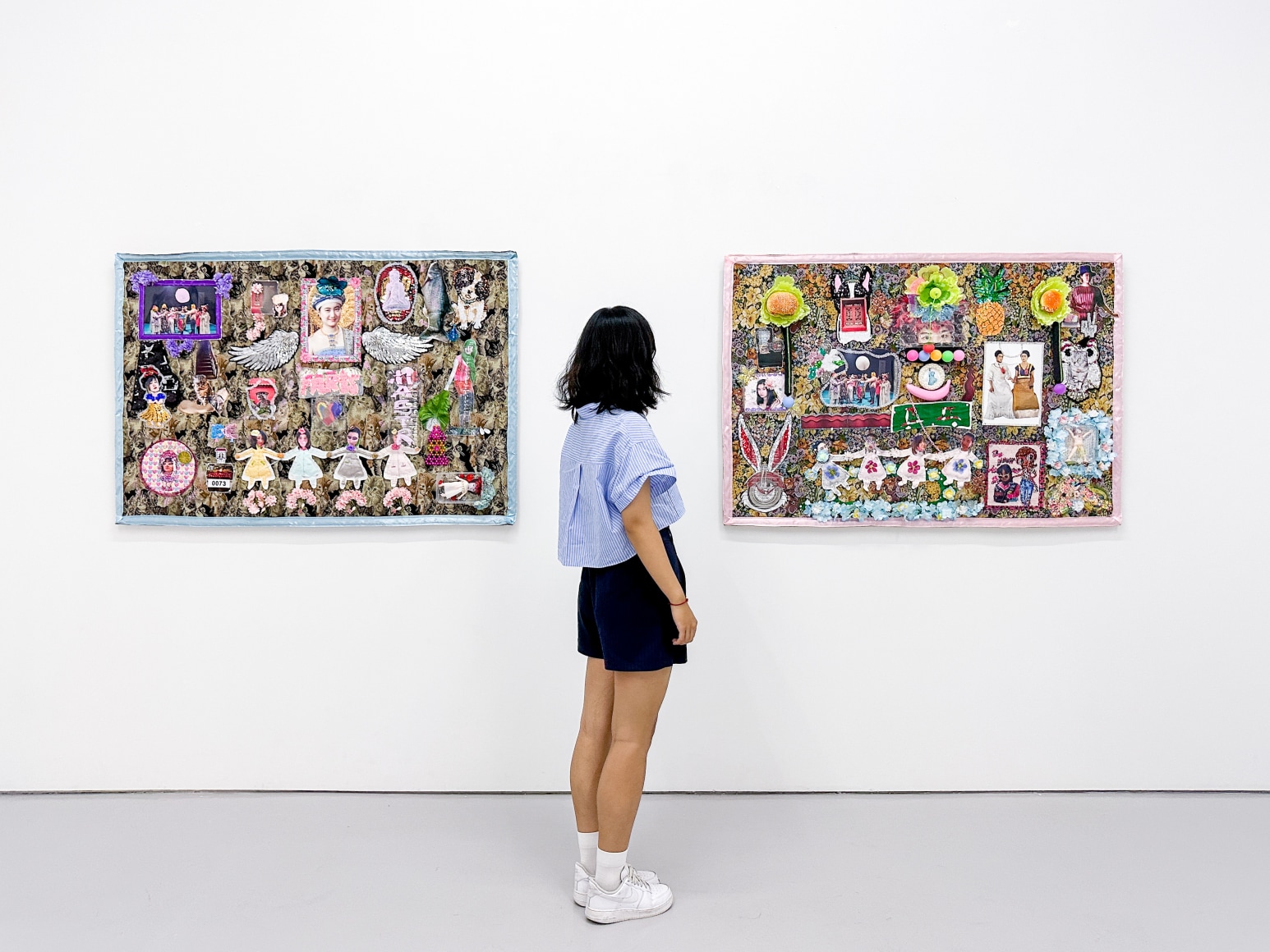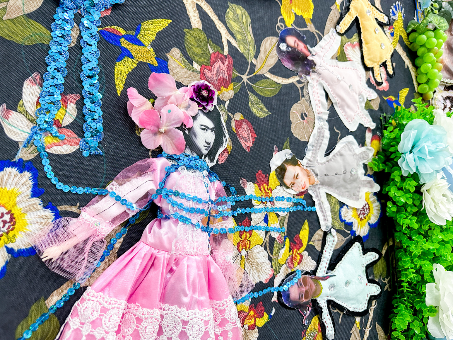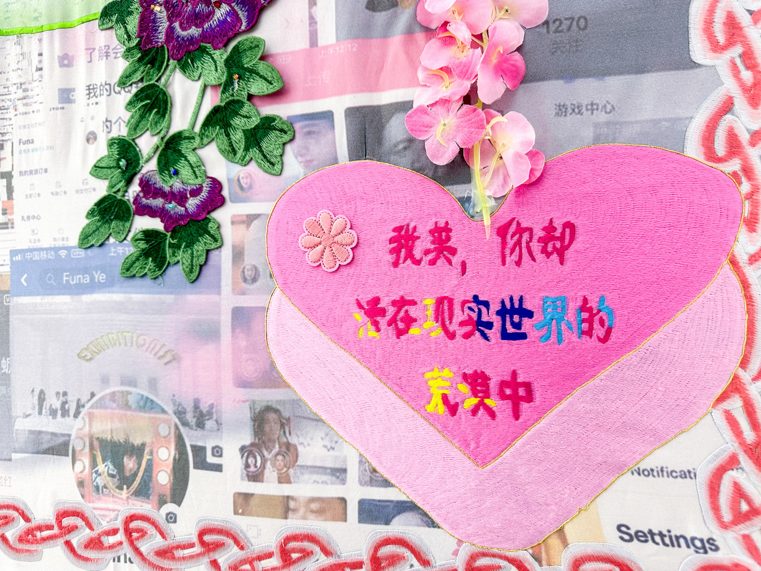Ye Funa sees through this process of merging a contemporary framework with traditional skills by working and sewing with her mother, in an impromptu style. This methodology of working also constitutes an “in-between space,” consolidating both the private channels of art creation and the public domain of tradition. Graduating from and teaching at the School of Experimental and Sci-Tech Arts at the Central Academy of Fine Art (which was initially called the “Folk Art Department''), Ye Funa is fluent in the expression of traditional mediums such as paper-cutting, stitching, and embroidery. When approaching this new body of work, she initially provided a tone and a theme, but intentionally left many voids for the details and the potential development of the stories. With the crafty hands of her mother, Funa would then continue these initial prompts without further limits. She describes the creation process as “emotional and free-flowing”. The co-creation process between the artist and her mother also echoes Funa’s determination to empower women in the Chinese society, which has been a prominent component throughout her artistic career.