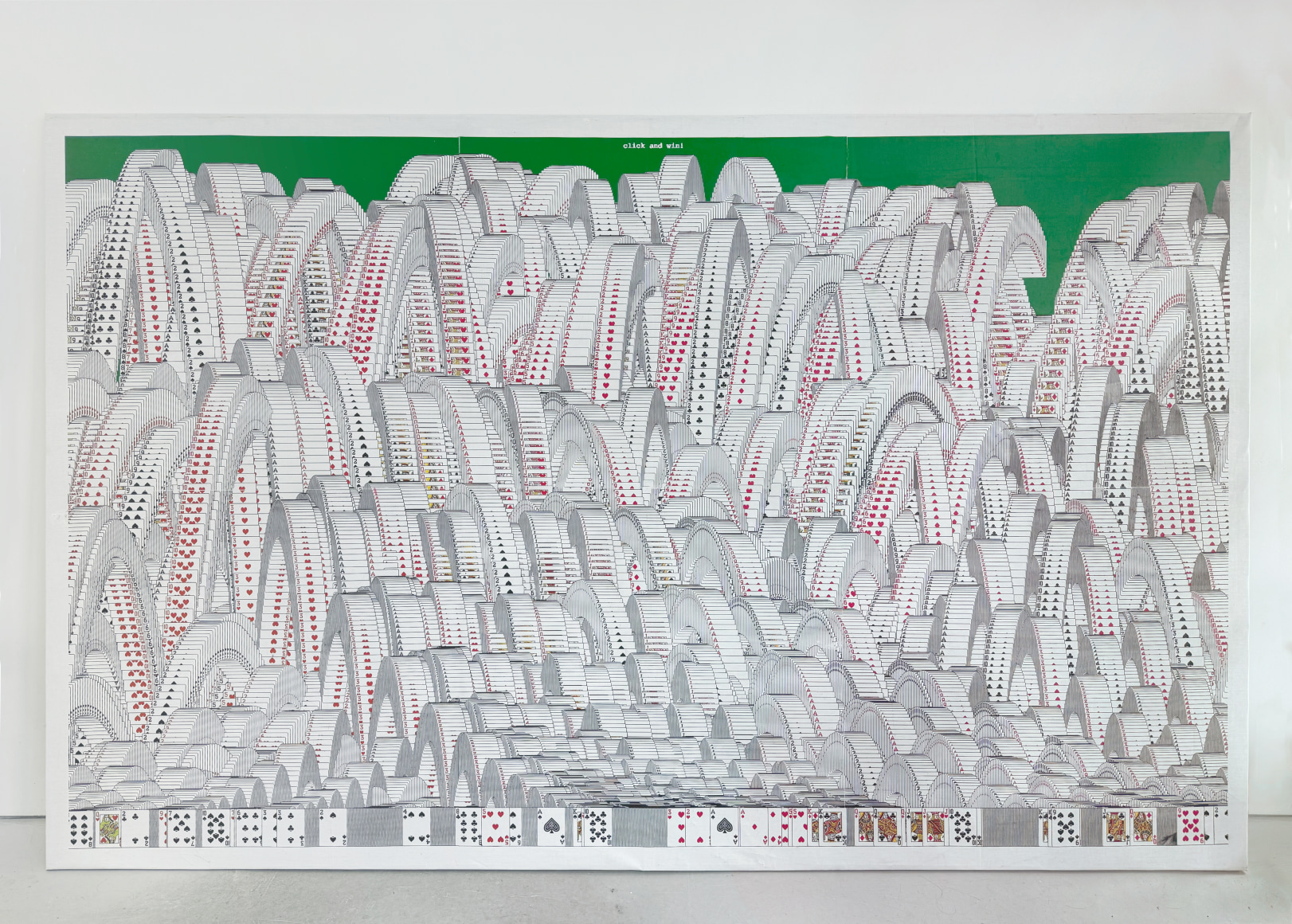 Quan Wenfei, a self-proclaimed “internet archeologist,” is a highly skilled printmaker. Using oil and silkscreen on canvas (a print-making method popularized by Andy Warhol), Wenfei creates unique works based on retro computer games in the 90s from Solitaire to Minesweeper. These witty images comment on how our aesthetics were trained digitally, and document the brief history of the dopamine-feeding machine. With a unique curiosity in the understudied history of the internet, Wenfei continues to dig in the graveyard of 90s aesthetics, arguing for their importance in contemporary behavioral studies. Wenfei wants to be the ultimate “sky-cam,” who observes the observers (the internet).