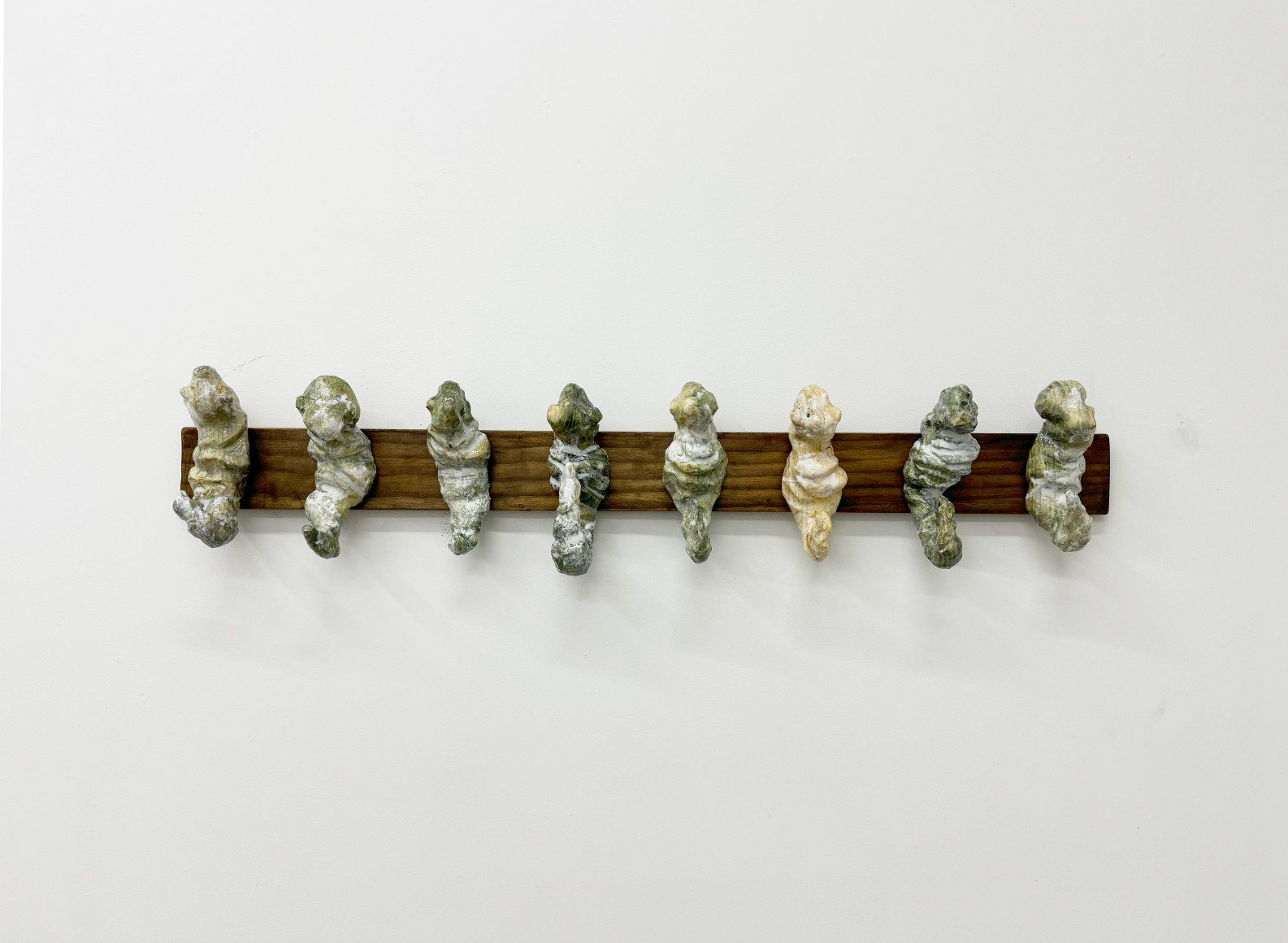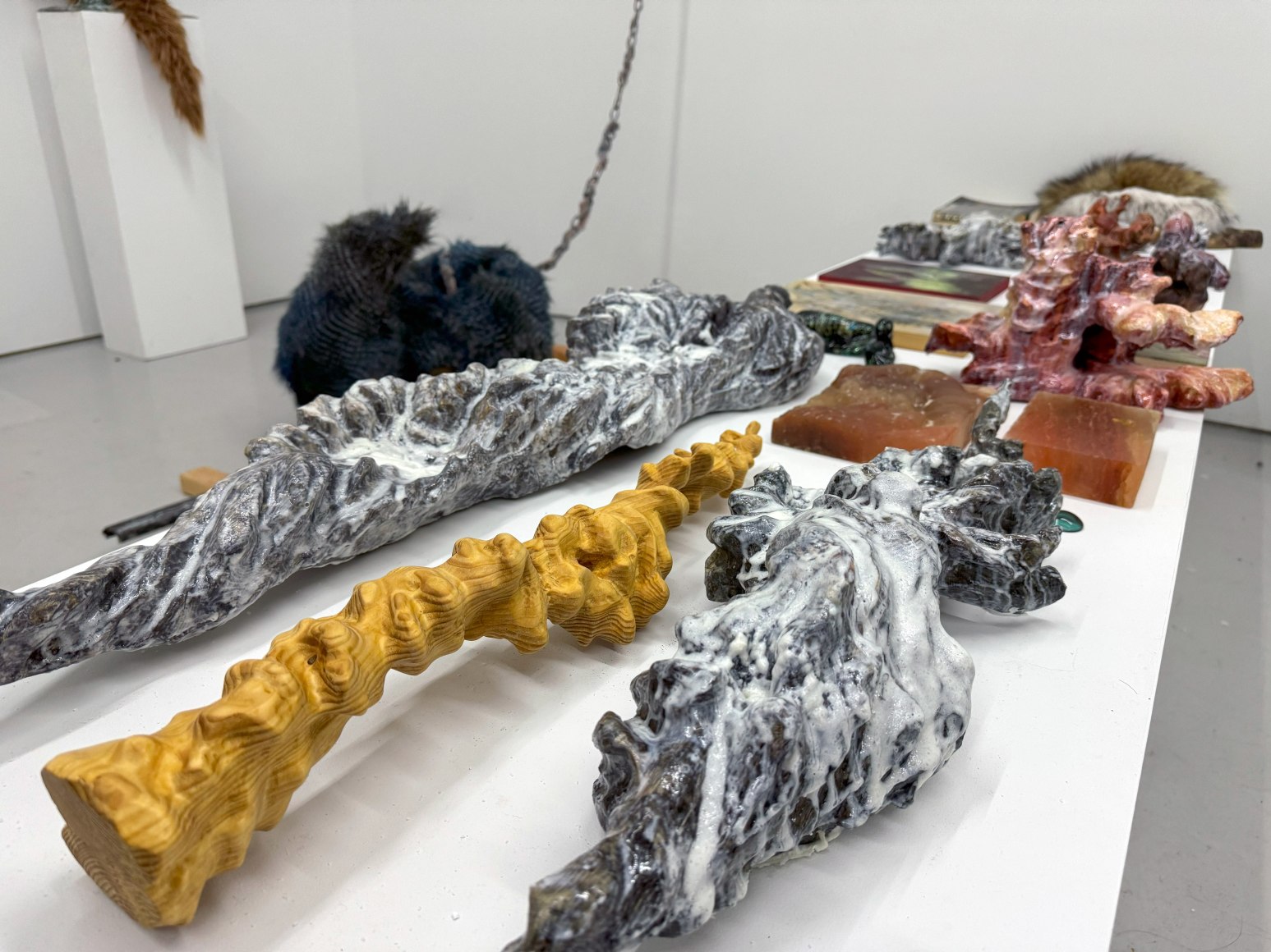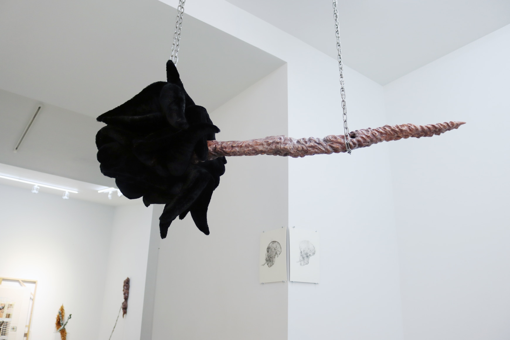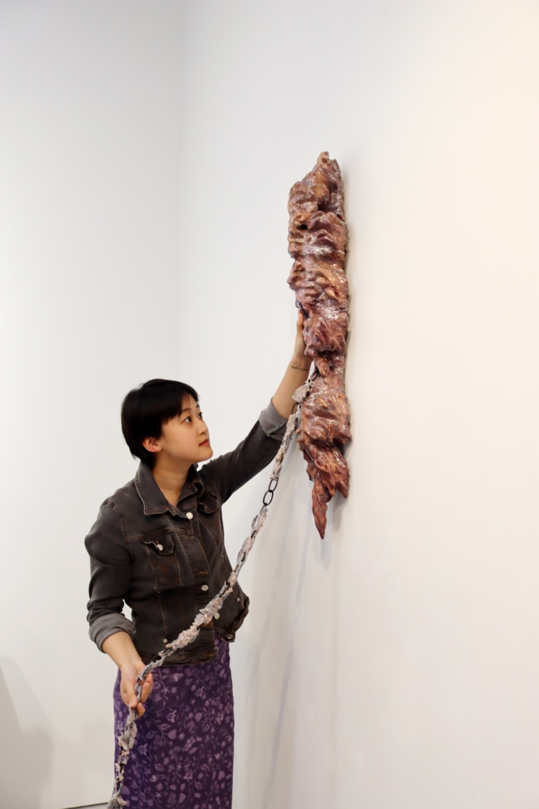 Finally, Echo Youyi Yan’s works present the metamorphosis of bodies in different contexts. Inspired by French artist Pierre Huyghe, she creates research-driven works that are based on a myriad of fields including zoology, anthropology, and eroticism. Echo’s lexicon consists of a “Cabinet of Curiosity,” as she imagines alternative paths of evolutions: a humanoid compressed into both a top and a bottom drawer from a cabinet, like a can of sardine; a turtle carries around a metal cage as an extra shell. These curious, eerie and sometimes alarming progressions of life forms apply to the human bodies as much as to the animals: a prolonged tongue gaining the ability to drill and poke; a umbilical cord providing nutrition from the true exterior. These lively forms will continue to mutate at the residency, infesting the gallery space over the summer. The audiences are advised to venture with caution.