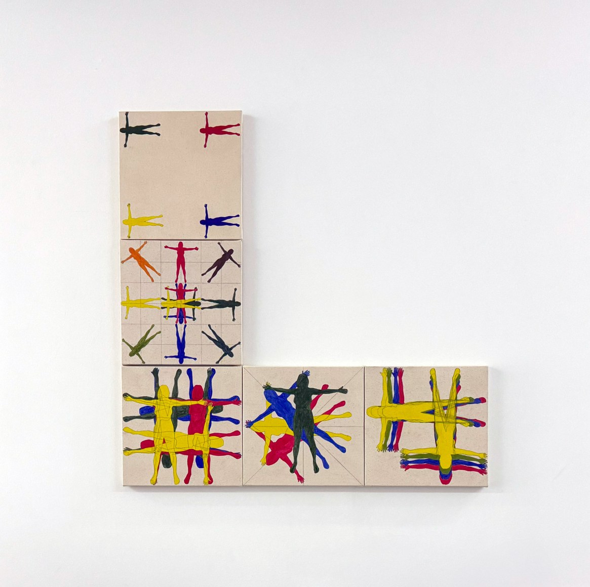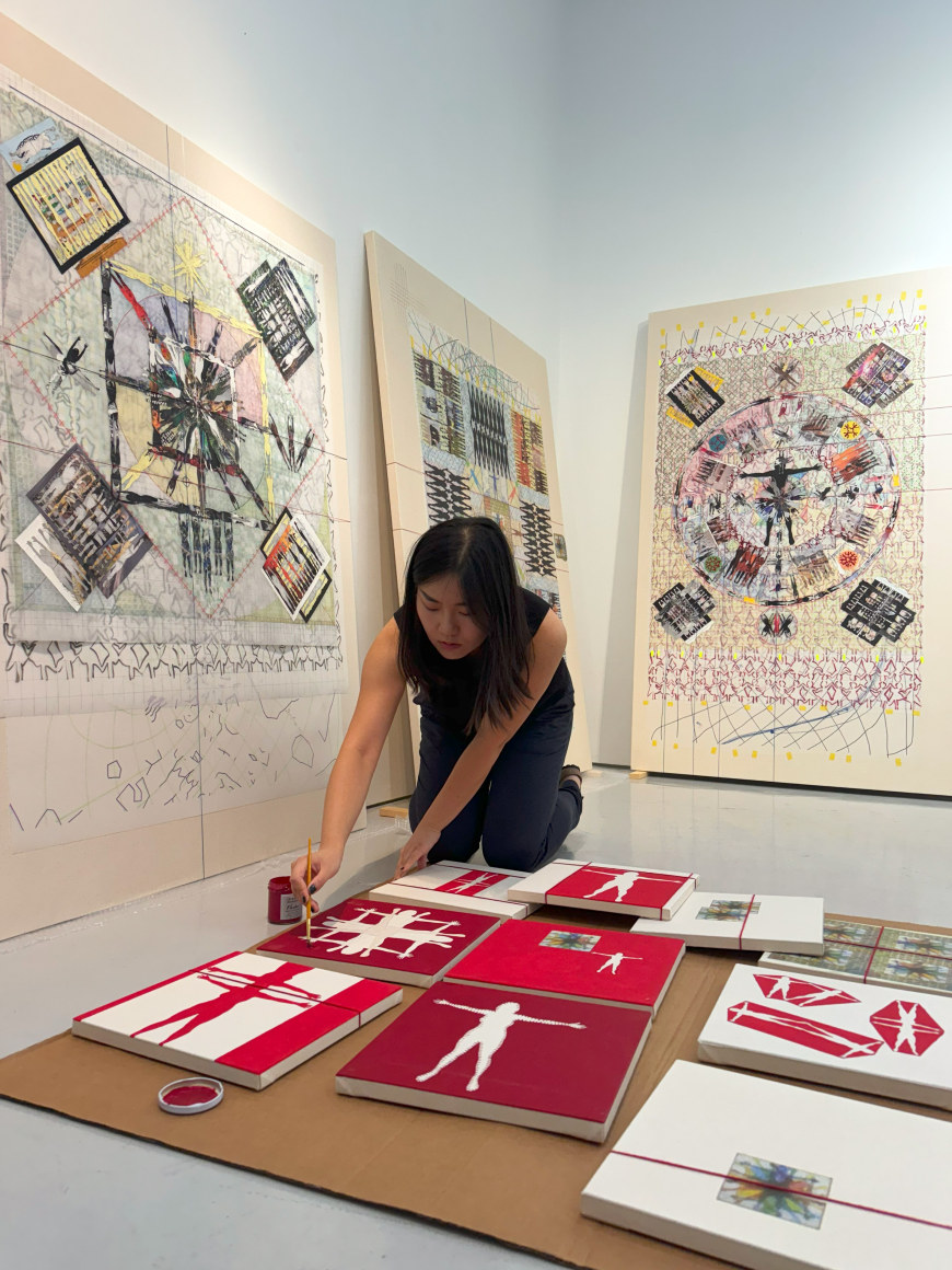 Similarly, Yang Shuai’s mastery in printmaking enables her to apply the principles of “multiplicity”—the very core of printmaking—onto other mediums. Her practice is centered around a prototype “figure” which represents herself, any individual human being, and the aggregation of humans altogether. This Trinitarian figure (whose contour curiously resembles a more feminine Da Vinci's Vitruvian Man) is then duplicated, layered, organized, colored, arranged, re-arranged into specific scenarios on each canvas. As a single print, the figure seems susceptible to being manipulated and influenced. But once placed in different  environments, these figures become groups, associations, and societies, reminiscent of individuals functioning in our world. In “At-Will Adaptation,” these figures will continue to adapt - or perhaps - they might refuse to do so voluntarily?