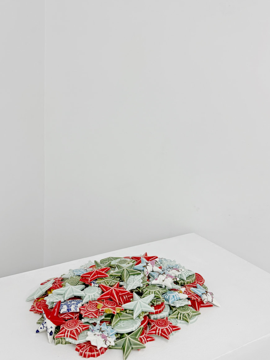 Truong Tan, who was considered the first openly gay artist from Vietnam, creates work that is both emblematic and groundbreaking in its exploration of social norms and marginalized identities. Blending historical research with conceptual art not taught in Vietnam’s educational system, Bui Cong Khanh playfully, yet critically, challenges official reward systems by combining porcelain military insignias from multiple nations to question the authority behind medals. Vietnamese lacquer serves as the core medium in Oanh Phi Phi’s practice, through which she explores the transmission of memory, reflections on image theory, and experimental possibilities in scale and technique. Bui Thanh Tam blends the delicate spirit of Vietnamese folk traditions with the bold allure of pop and consumer culture, creating works that are at once challenging, seductive, and provocative.