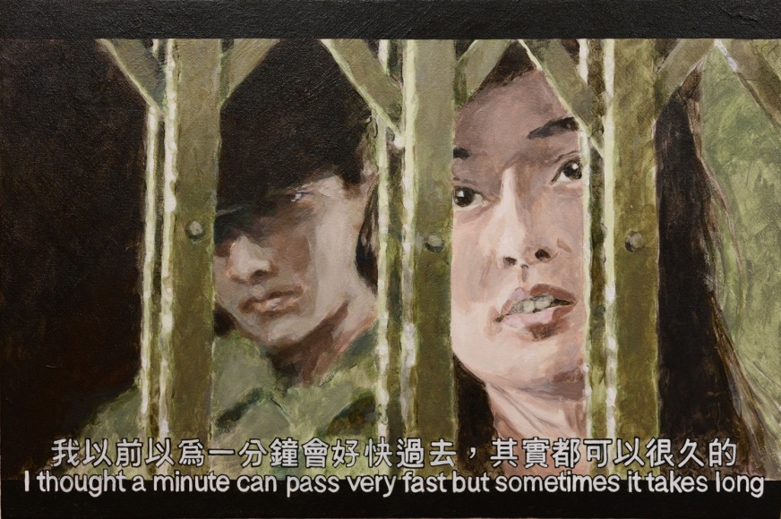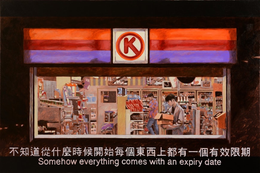 In Chungking Express, “Somehow everything comes with an expiry date" (2016), one of the paintings shown in the exhibition, the artist painted the highly recognized movie still in which the protagonist says “somehow everything comes with an expiry date” while mourning for his lost relationship. Reiterating the uncertainty and melancholy portrayed in Chungking Express, the artist alludes to the societal tension before the 1997 handover.