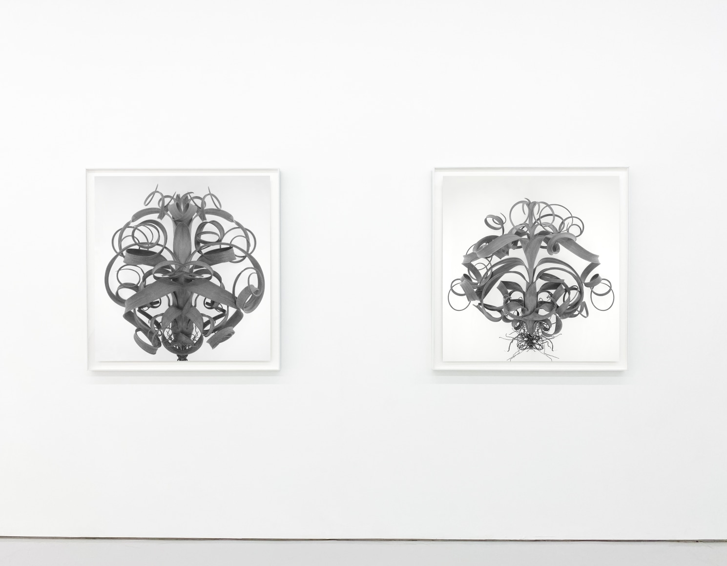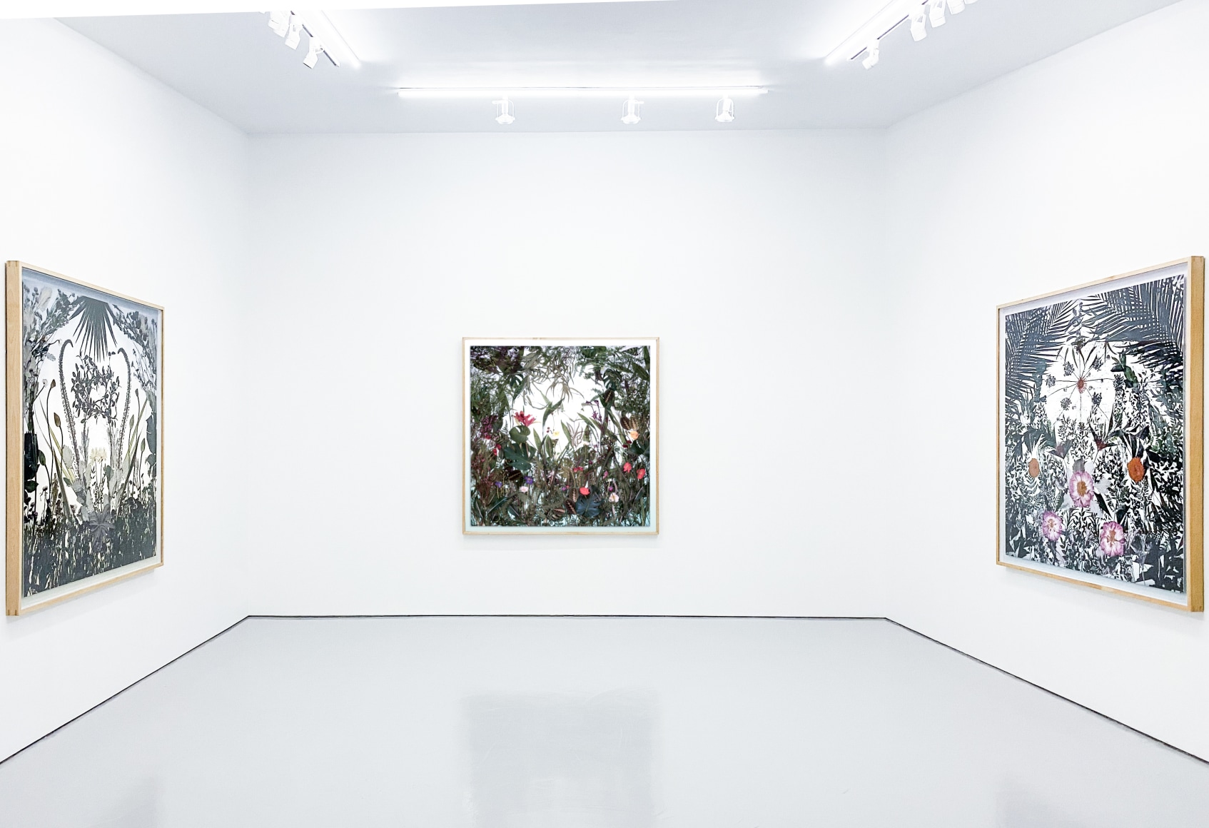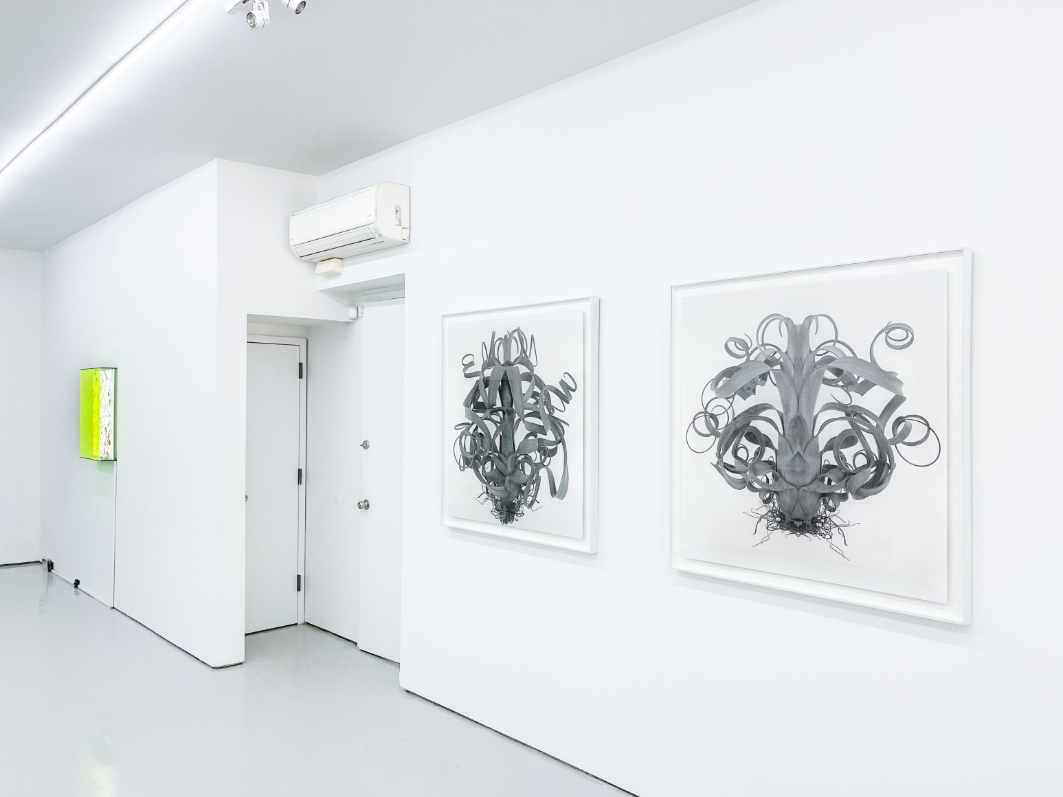 This exhibition is also the debut of the Plant portrait - Tillandsia (2022) series. In contrast to Ji Zhou’s other works in this show, sophisticated plant arrangements are absent. Tillandsia, a tenacious plant that can grow merely by absorbing nutrients and moisture in the air, are presented in monochrome in this series. Even in a “hopeless” environment, this plant can still grow exuberantly. Each work was made by combining two photographs: the left and right half. While both photos seem to match perfectly in each work, there are still subtle dissonances. In fact, Ji Zhou intentionally arranged the photos to create a barely noticeable distinction in each work, creating another layer of artificiality to what at first glance, suggests natural growth. Under this symbiotic setup, different snapshots are fused into a new hybrid.
