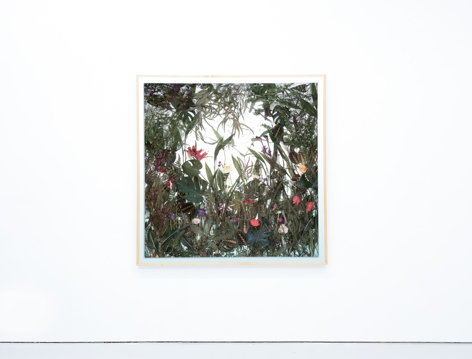 Symmetry and asymmetry, order and disorder, are embodied in Ji Zhou’s works. In Full Bloom (2021) and Prosperity (2021), the artist placed plants and flowers in man-made arrangements, misrepresenting what’s natural. Plants grow wildly around a central pattern composed with flowers and branches to form a vibrant scene and reflect the vitality that plants exude. Although Hasht Bihisht (2021) follows a similar plant placement format, the artist chose to arrange each plant in a more disorderly placement. A few colorful flowers bloom and are intertwined with withered branches and leaves, creating a paradox in which vitality and gloom co-exist. Additionally, the disordered arrangement of plants in Ji Zhou’s works indicates the blurred boundaries amongst plants. The duration required for plants to grow to maturity is concealed when stacking them together; each plays a valuable role in the natural environment and should be respected.