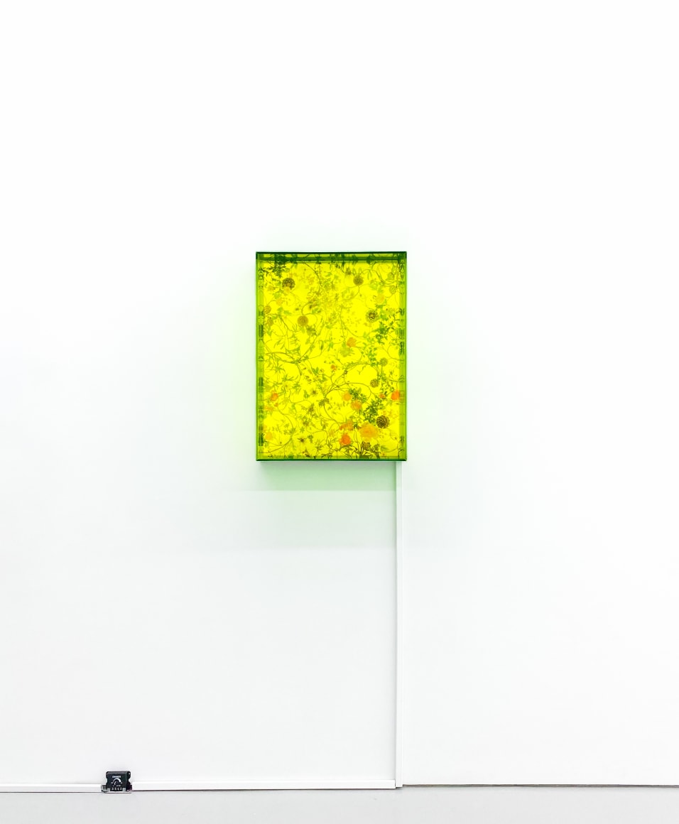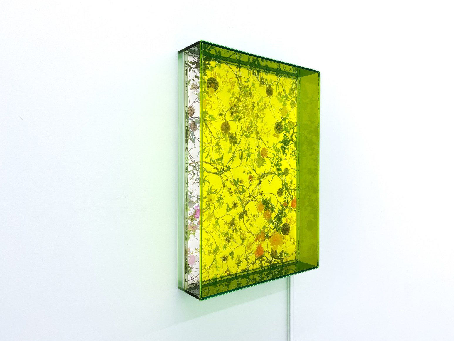 Under a monochromatic filter, Twining Florets (2021), a lightbox work, shows a seemingly contradictory, but intertwined, scene of reality and fantasy. Staying home during the pandemic forced many people to lose direct contact with the natural world, leaving their memories of nature and plants blurred. The sides of the lightbox are left uncolored, allowing the viewers to see the original color of the work through the slit. Although the entirety of the image is still inaccessible via this view, it is enough to restore, aided by one’s imagination, the original appearance of the part covered by the filter.