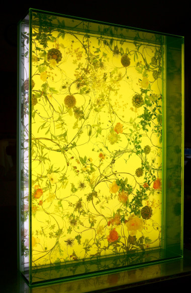 Under a monochromatic filter, Twining Florets (2021), a lightbox work, shows a seemingly contradictory, but intertwined, scene of reality and fantasy. Staying home during the pandemic forced many people to lose direct contact with the natural world, leaving their memories of nature and plants blurred. The sides of the lightbox are left uncolored, allowing the viewers to see the original color of the work through the slit. Although the entirety of the image is still inaccessible via this view, it is enough to restore, aided by one’s imagination, the original appearance of the part covered by the filter.