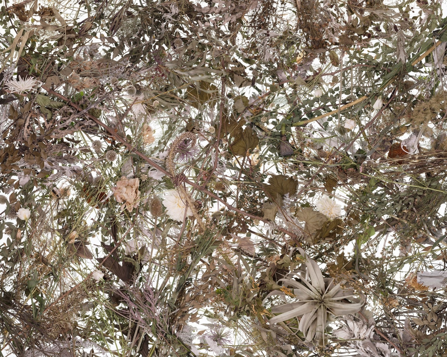 Symmetry and asymmetry, order and disorder, are embodied in Ji Zhou’s works. In Full Bloom (2021) and Prosperity (2021), the artist placed plants and flowers in man-made arrangements, misrepresenting what’s natural. Plants grow wildly around a central pattern composed with flowers and branches to form a vibrant scene and reflect the vitality that plants exude. Although Hasht Bihisht (2021) follows a similar plant placement format, the artist chose to arrange each plant in a more disorderly placement. A few colorful flowers bloom and are intertwined with withered branches and leaves, creating a paradox in which vitality and gloom co-exist. Additionally, the disordered arrangement of plants in Ji Zhou’s works indicates the blurred boundaries amongst plants. The duration required for plants to grow to maturity is concealed when stacking them together; each plays a valuable role in the natural environment and should be respected.