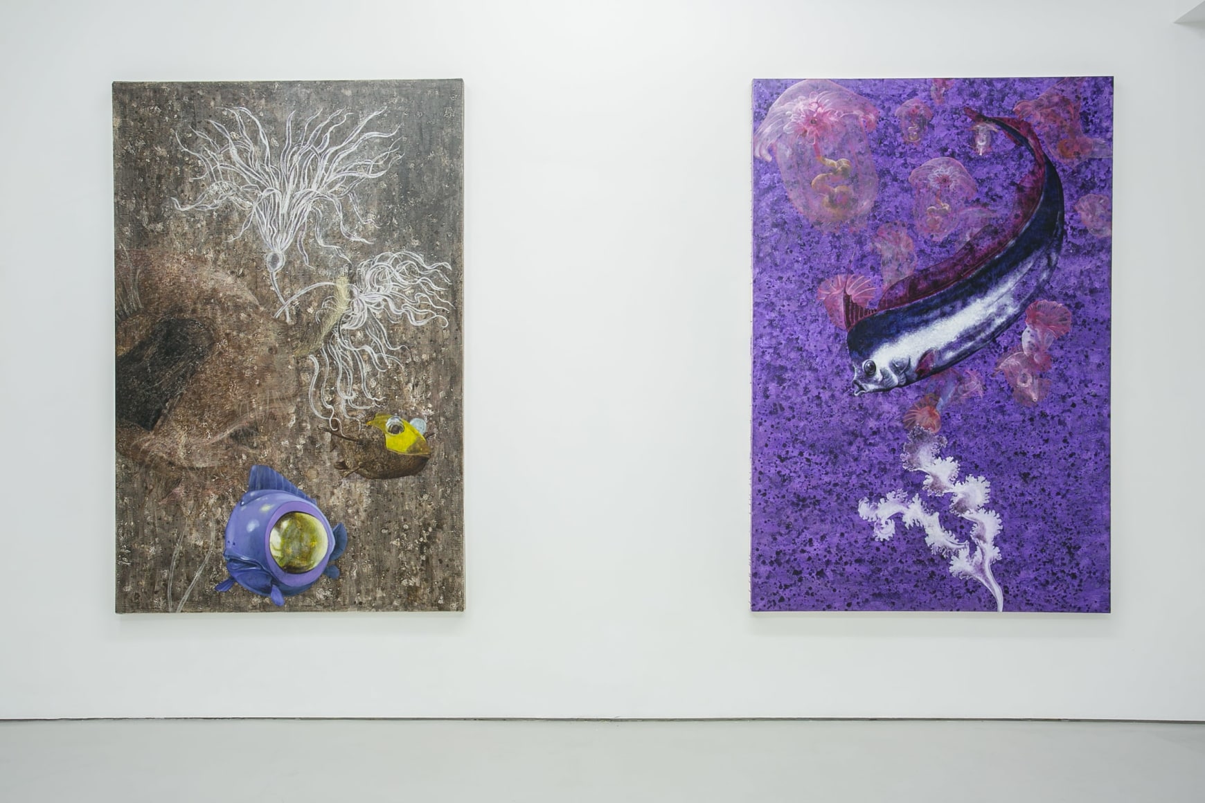 Both Su Wong-Shen and Yang Mao-Lin’s work reference the absurdity and obscurity from the animal kingdom, while shedding highly relevant lights on human society. Su Wong-Shen often paints from a bird's-eye viewpoint, connecting social emotions such as isolation and humanly love with its equivalence in the animal kingdom. Yang Mao-Lin expresses his contemplation on life and passion for the unknown in his paintings of wild and bizarre deep-sea creatures, with a subtle mythological undertone that has always been present in his oeuvre.