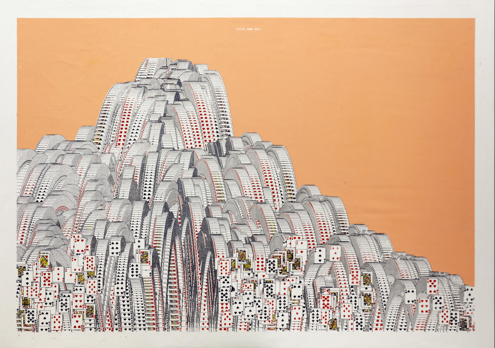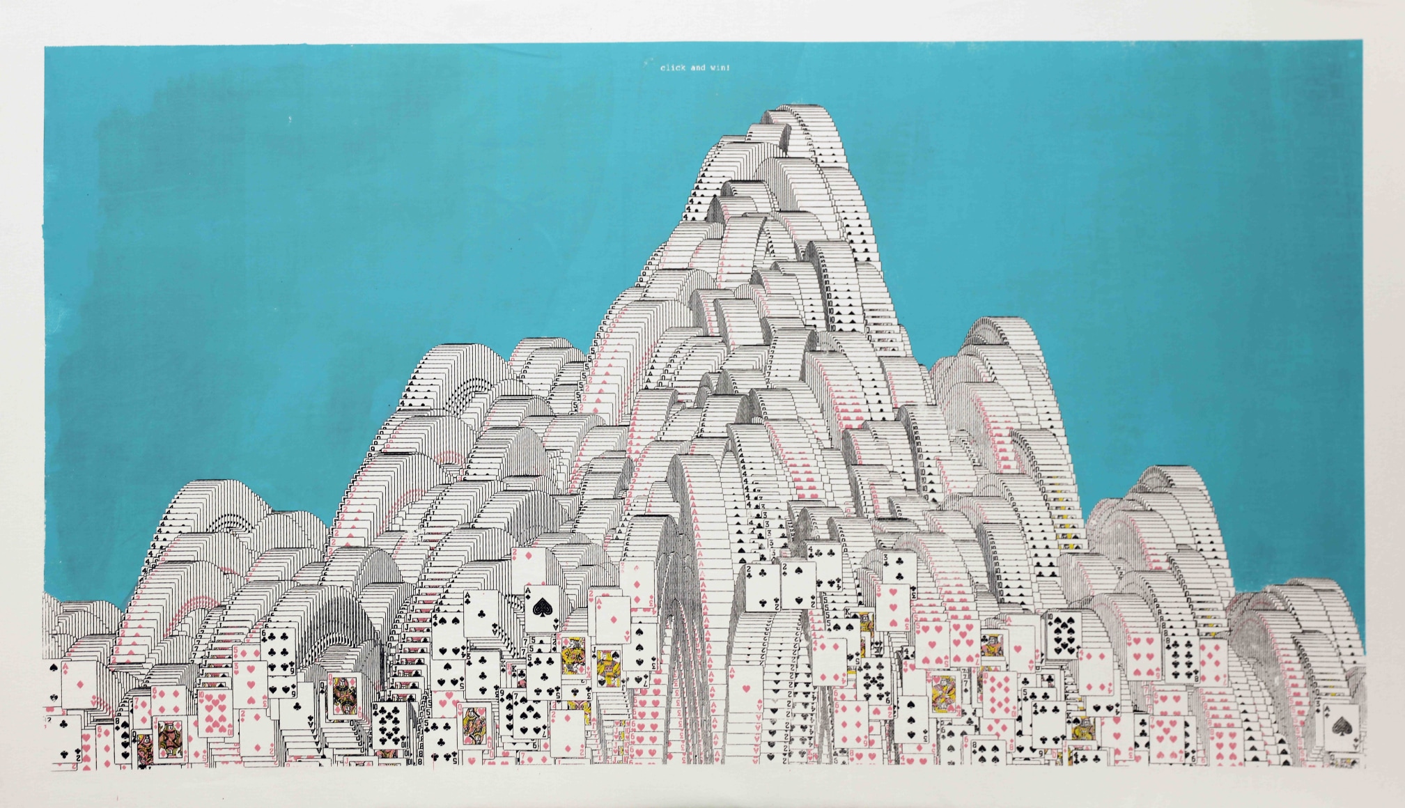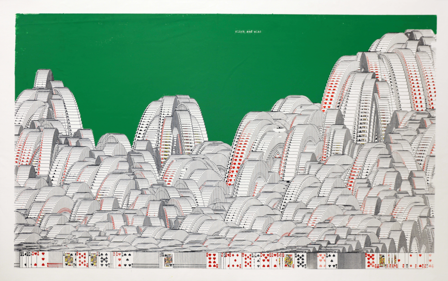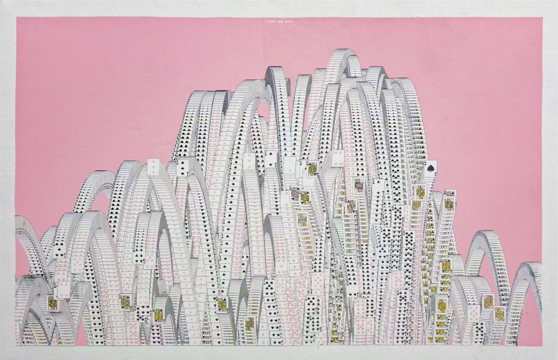 Extending her timeline further into the past is the inspiration of her print series “Click and Win!.” The retro card game, once a pastime for Quan, is reinterpreted as bearing the compulsive quality of birds pecking at their own feathers: “you think you are entertaining yourself, but in fact it is self-harming.” At the moment of victory, the cards burst like fireworks, releasing a rush of joy that is at once ecstatic and hollow. This fleeting instant is what the artist freezes onto canvas. By manipulating scale, color, and composition, Quan guides viewers in excavating this relic of the nostalgic internet era. Such archaeology also traces the roots of today’s digital visual aesthetics and humanity’s obsession with dopamine-driven reward systems.