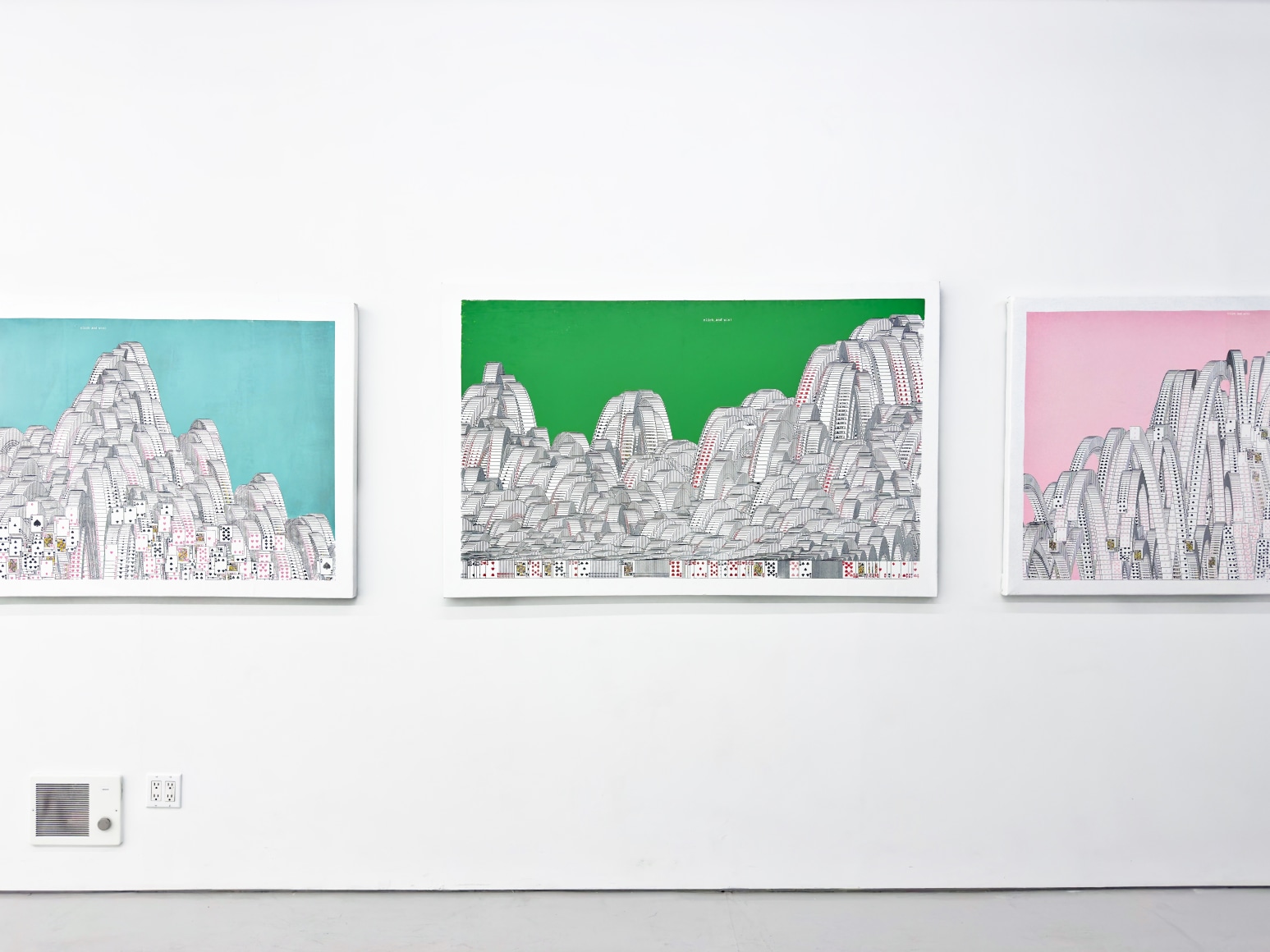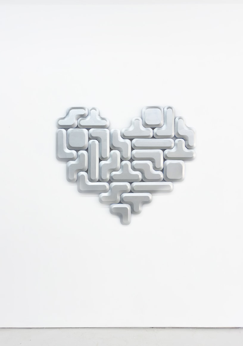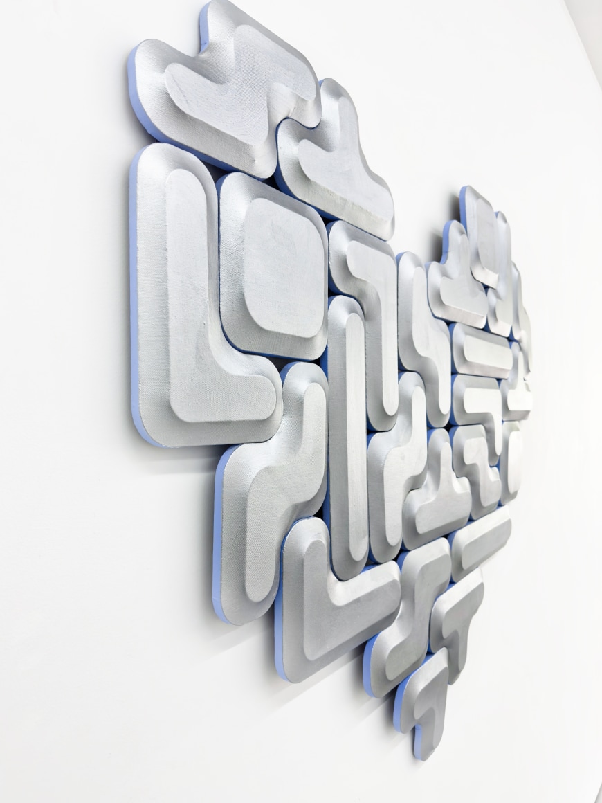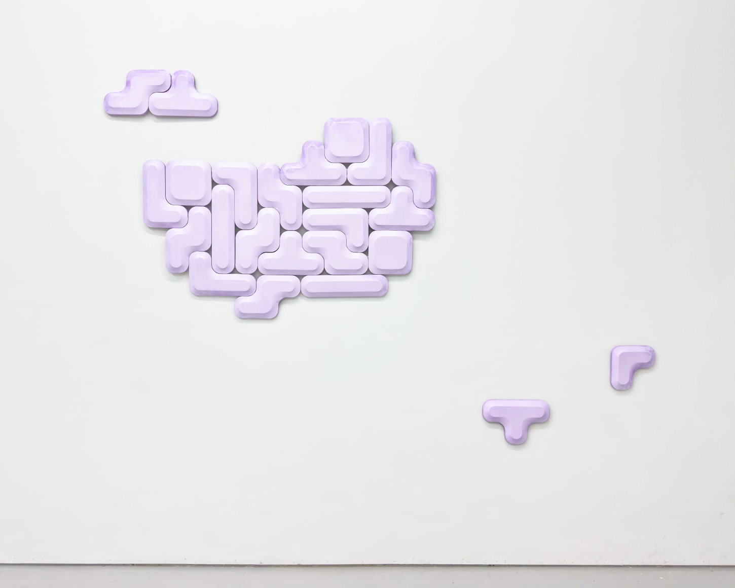 Quan’s “Tetris” series marks another experiment in her internet archaeology. Moving beyond silkscreen, she employs oil paint and movable, interlocking modules to test the dynamics of individuals and collectives. Tetris fragments scattered across different strata are reassembled into a curated whole. “Just like in the game, individuals stack together into a community, searching for their common ground, only to dissolve again through homogenization.”