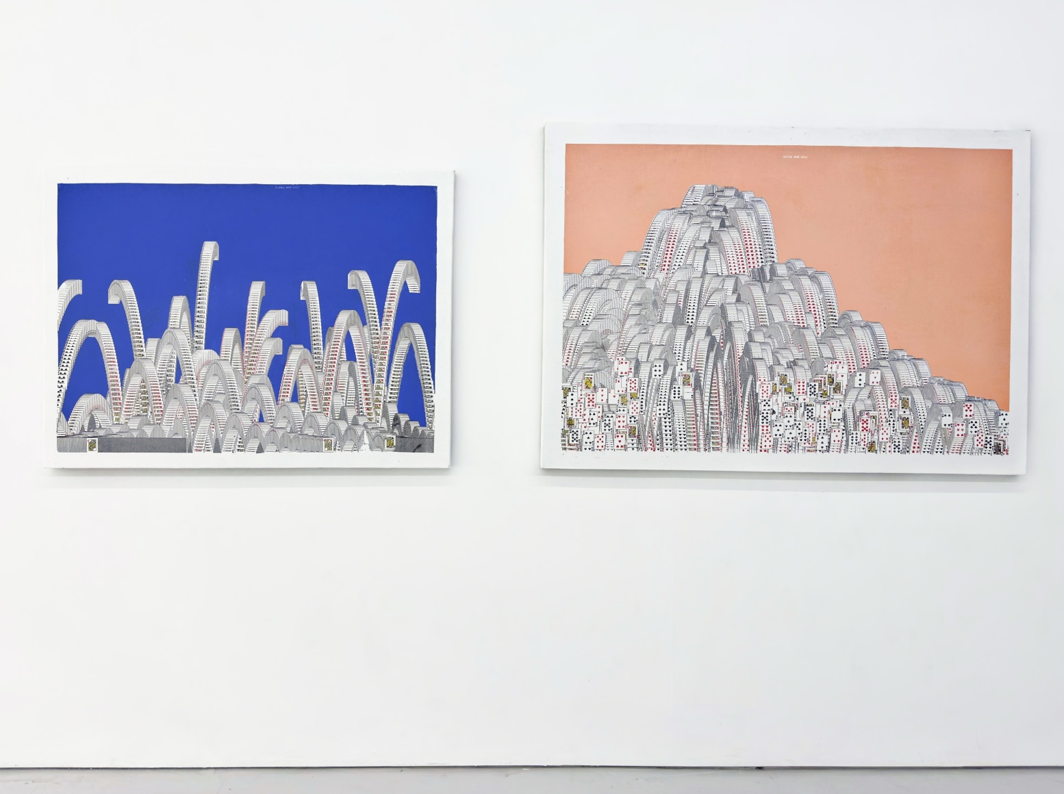 Extending her timeline further into the past is the inspiration of her print series “Click and Win!.” The retro card game, once a pastime for Quan, is reinterpreted as bearing the compulsive quality of birds pecking at their own feathers: “you think you are entertaining yourself, but in fact it is self-harming.” At the moment of victory, the cards burst like fireworks, releasing a rush of joy that is at once ecstatic and hollow. This fleeting instant is what the artist freezes onto canvas. By manipulating scale, color, and composition, Quan guides viewers in excavating this relic of the nostalgic internet era. Such archaeology also traces the roots of today’s digital visual aesthetics and humanity’s obsession with dopamine-driven reward systems.