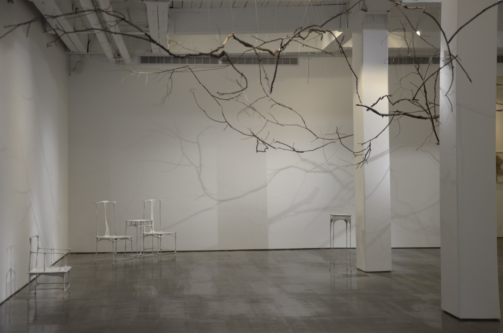 The interactive mobile, "Suspension Strategy," is suspended throughout the length of the gallery and created from tree branches found in New York and Connecticut, as well as cast bronze models of Chinese tree branches. The beauty of the mobile lies in the whimsical and precarious feeling conveyed by the swaying and floating objects freed from a grounded trunk. Strings hanging down from the ceiling allow viewers to manipulate the mobile themselves and create a sense of free flowing movement.
