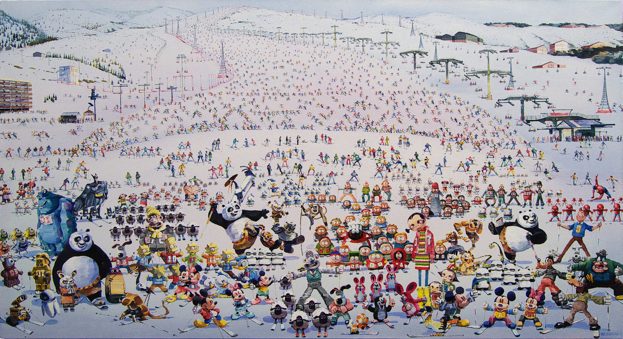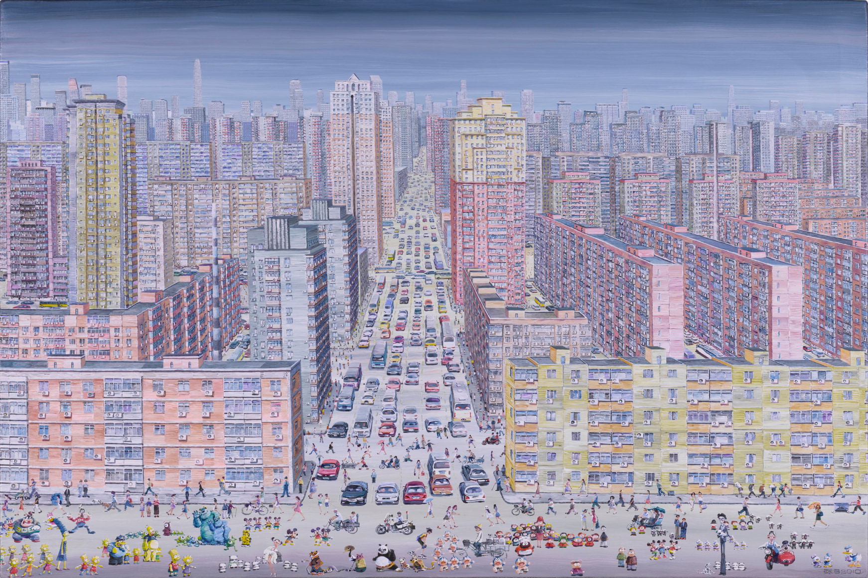 Close attention reveals that the cartoons which were characteristic of Zhang Gong’s earlier work now take a backseat to the prominence of the rows of looming buildings. His latest work gives way to a new theme where abstract form supersedes narrative, and definitive interpretation has given way to mere suggestion.