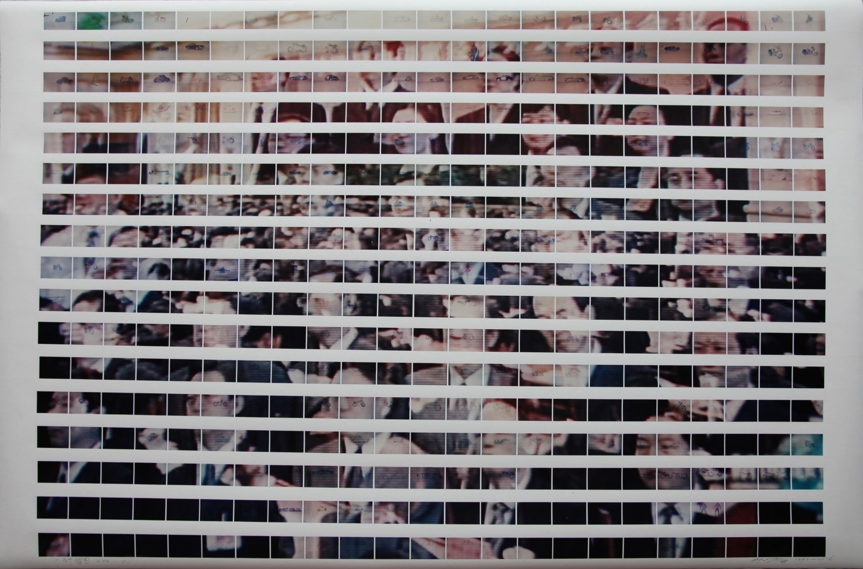 The exhibition also includes Zheng Guogu’s later works from 1997 to the early 2000s in which he arranged extremely small images that are barely visible on a single sheet of paper. His best-known work from this period is Ten Thousand Customers (1997), conceived as an edition of 10,000 unique prints all dealing with the contemporary media environment. The mass-scale, double-exposed images reflect Zheng Guogu’s view of the overstimulation of Chinese mass media. On the one hand, the number of images contained in the photo-mosaic speaks to the overstimulation and mass scale of media consumption. At the same time, it also plays on the value of exclusivity in the art world.